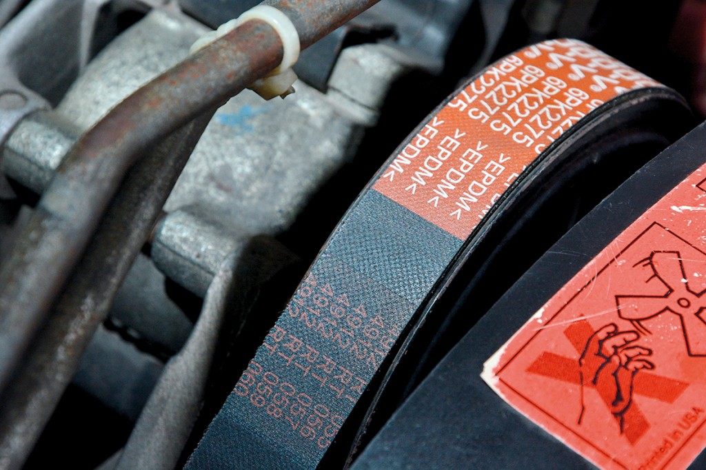 ให้ตรวจสอบสายพานขับปั๊มน้ำอัลเทอร์เนเตอร์ โดยดูขอบด้านข้าง และ "ท้อง" หรือสันด้านในของสายพาน ส่วนด้านนอกมักไม่มีอาการให้เห็น ข้อสำคัญต้องตรวจให้ครบทั้งเส้น จำตำหนิ หรือถ้าไม่มีก็ให้ทำตำหนิไว้ แล้วสตาร์ทเครื่องยนต์สั้นๆ ให้สายพานหมุนโดยไม่ให้เครื่องยนต์ติด เพื่อให้สายพานที่ถูกบังซ่อนในเครื่องยนต์เลื่อนออกมาจนเราสามารถตรวจได้ครบทั้งเส้น