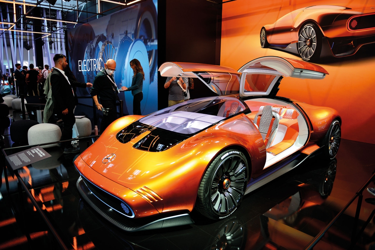 รถแนวคิดพลังไฟฟ้า MERCEDES-BENZ VISION ONE-ELEVEN (เมร์เซเดส-เบนซ์ วิชัน วัน-อีเลเวน) เปิดตัวเมื่อเดือนมิถุนายน 2023 แต่ทีมงานของเราเพิ่งมีโอกาสสัมผัสตัวจริงเป็นครั้งแรกที่งานนี้ เป็นรถแนวคิดในรูปลักษณ์ของรถสปอร์ท “ไฮเพอร์คาร์” ประตูปีกนก ซึ่งมีตัวถังยาว 4.600 ม. มีห้องโดยสารที่นั่งได้เพียง 2 คน และติดตั้งล้อขนาดโตถึง 22 นิ้ว ส่วนระบบขับใช้มอเตอร์ไฟฟ้า AXIAL-FLUX ELECTRIC MOTOR (แอคเซียล-ฟลักซ์ อีเลคทริค มอเตอร์) 2 ชุด ซึ่งยังไม่มีการเปิดเผยขนาดกำลัง แต่ค่าย “ดาวสามแฉก” ยืนยันว่ามีน้ำหนักเบาเป็นพิเศษ ทำงานร่วมกันกับ LIQUID-COOLED CYLINDRICAL CELLS BATTERY ซึ่งเป็นแบทเตอรีที่มีเซลล์รูปทรงกลม และระบายความร้อนด้วยของเหลว ที่เพิ่งพัฒนาขึ้นใหม่โดยหน่วยงานย่อยของค่ายนี้ที่ตั้งอยู่ในเกาะอังกฤษ เห็นรูปทรงอย่างใกล้ชิดแล้ว ทำให้ยากจะเชื่อว่า วันหนึ่งในอนาคตรถแนวคิดคันนี้จะเปลี่ยนสภาพเป็นรถผลิตเพื่อจำหน่าย