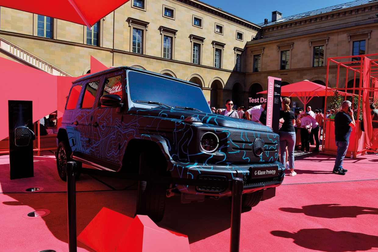 รถติดโลโก “ดาวสามแฉก” อีกคันซึ่งปรากฏตัวให้เห็นเป็นครั้งแรกที่งานนี้ คือ รถติดป้ายชื่อ MERCEDES-BENZ G-KLASSE PROTOTYPE (เมร์เซเดส-เบนซ์ จี-คลาสส์ พโรโทไทพ์) ซึ่งเป็นพัฒนาการล่าสุดของรถกิจกรรมกลางแจ้ง MERCEDES-BENZ G-KLASSE ที่อยู่ในสายการผลิตมาแล้วยาวนานกว่า 4 ทศวรรษ และเป็นต้นแบบของรถรุ่นปรับปรุงแบบ FACELIFT หรือ “ยกหน้า” ที่มีกำหนดเปิดตัวแบบ WORLD PREMIERE หรือ “ครั้งแรกในโลก” ในปี 2024 และจะมีโมเดลที่ติดตั้งระบบขับด้วยพลังไฟฟ้าล้วนๆ ให้เลือกใช้ด้วย ตัวถังมีรูปทรงองค์เอวแทบไม่ผิดเพี้ยนจากรถที่จำหน่ายอยู่ในขณะนี้ แต่มีการปรับปรุงเปลี่ยนแปลงรายละเอียดมากมายเพื่อเพิ่มสมรรถนะทางอากาศพลศาสตร์ โดยใช้กลวิธีเดียวกันกับรถกิจกรรมกลางแจ้งพลังไฟฟ้าล้วนๆ MERCEDES-EQ EQG (เมร์เซเดส-อีคิว อีคิวจี) ซึ่งอีกไม่นานก็จะถึงกำหนดวันเปิดตัวและเริ่มการจำหน่ายเช่นกัน