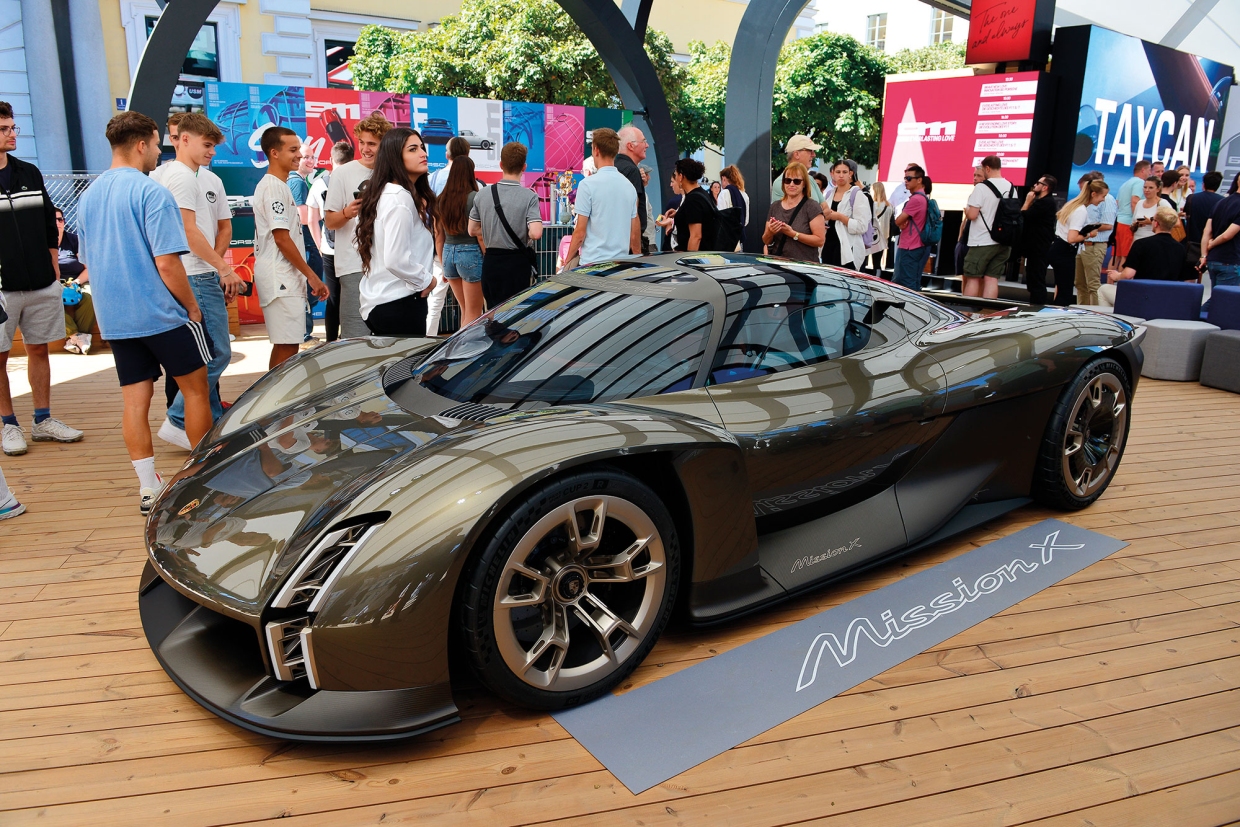 PORSCHE MISSION X (โพร์เช มิชชัน เอกซ์) เปิดตัวที่เมือง STUTTGART (ชตุทท์การ์ท) ในเยอรมนีเมื่อต้นเดือนมิถุนายน 2023 และเป็นรถอีกคันที่ทีมงานของเราเพิ่งมีโอกาสสัมผัสตัวจริงเป็นครั้งแรกที่งานนี้ เป็นรถแนวคิดในรูปลักษณ์ของรถสปอร์ท “ไฮเพอร์คาร์” ซึ่งไม่มีการติดตั้งเครื่องยนต์ใดๆ เพราะเป็นรถพลังไฟฟ้าล้วนๆ ตัวถังซึ่งยาวประมาณ 4.50 ม. และกว้างประมาณ 2.00 ม. ติดตั้งประตูแบบปีกนกที่ขณะเปิดประตูจะดูโดดเด่นสะดุดตามาก และมีห้องโดยสารที่นั่งได้เพียง 2 คน ไม่มีการเปิดเผยรายละเอียดใดๆ ของระบบขับ บอกเพียงแต่ว่า เมื่อเปลี่ยนสภาพเป็นรถตลาด หรือรถผลิตเพื่อจำหน่ายอย่างสมบูรณ์แบบ มีอยู่หลายสิ่งที่รถพลังไฟฟ้าแบบอื่นๆ ทำไม่ได้ แต่รถแบบนี้จะทำได้ ตัวอย่างเช่น มี POWER-TO-WEIGHT RATIO หรืออัตราส่วนกำลังต่อน้ำหนัก ระดับ 1.0 แรงม้า/กก. มีค่า DOWNFORCE หรือแรงกดลงสู่พื้นถนน สูงกว่า 860 กก. เมื่อวิ่งเร็ว 285 กม./ชม.