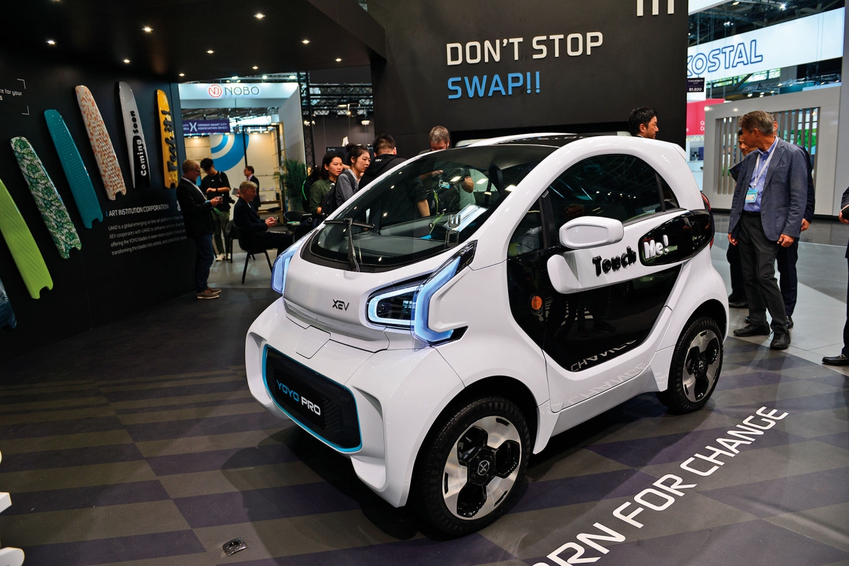 รถพลังไฟฟ้าของผู้ผลิตรายย่อยก็อวดตัวในงานนี้มากมายหลายรุ่นหลายแบบ เลือกที่น่าสนใจมา 3 แบบ แบบแรกในภาพใหญ่หน้าซ้ายมือ และภาพบนด้านซ้ายซึ่งติดป้ายชื่อ XEV YOYO PRO (เอกซ์อีวี โยโย พโร) เป็นผลงานของค่าย XEV บริษัทสตาร์ทอัพทวิสัญชาติ (อิตาลี-ฮ่องกง) ซึ่งเพิ่งก่อตั้งกิจการที่เมือง TURIN (ตูริน) ในอิตาลีเมื่อปี 2018 เป็นรถพลังไฟฟ้าล้วนๆ ขนาดกระจิริดกระจิ๋วหลิว ในตัวถังขนาด 2.530x1.500x1.570 ม. ที่นั่งได้เพียง 2 คน เป็นรถออกแบบในยุโรป แต่ใช้โรงงานซึ่งอยู่ในนครเซี่ยงไฮ้ของจีนเป็นที่ผลิต ระบบขับด้วยพลังไฟฟ้าล้วนซึ่งติดตั้งในรถที่มีน้ำหนักตัวพร้อมขับ 400 กก. และวิ่งได้เร็ว 69 กม./ชม. นี้ ใช้มอเตอร์ไฟฟ้าขนาด 15 กิโลวัตต์/20 แรงม้า ทำงานร่วมกันกับแบทเตอรี 10.3 กิโลวัตต์ชั่วโมง ซึ่งเมื่อชาร์จไฟเต็มรถจะวิ่งได้ไกล 150 กม. เป็นรถที่ตอนต้นปี มีข่าวเล่าลือว่าจะมีผู้นำเข้ามาขายในเมืองไทย เพราะรถไฟฟ้าสัญชาติจีนกำลังฮิท แต่จนถึงขณะนี้เชื่อว่ายังไม่มี