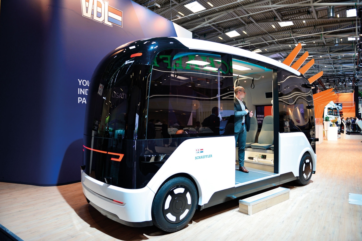 รถพลังไฟฟ้าล้วนๆ ที่น่าสนใจอีกแบบ คือ รถติดป้ายชื่อ VDL SCHAEFFLER (เวเดเอล เชฟฟเลอร์) ซึ่งเพิ่งเปิดเผยตัวต่อสายตาสาธารณชนเป็นครั้งแรกที่งานนี้ เป็นผลงานจากความร่วมมือของบริษัทครอบครัว 2 บริษัท คือ VDL กับ SCAEFFLER และเป็นรถที่ยังไม่มีการผลิตเพื่อจำหน่าย แต่ยังอยู่ในขั้นตอนของการออกแบบ/พัฒนา และตั้งเป้าหมายว่าจะนำออกวิ่งทดสอบตามถนนสาธารณะได้ในปี 2025 ก่อนเริ่มต้นการผลิตในปี 2030 เป็นรถโดยสารขนาดเล็ก ซึ่งมีตัวถังขนาด 5.0x2.2x2.8 ม. ติดตั้งเก้าอี้ที่นั่งรวม 9 ที่ มีพื้นรถต่ำ และติดตั้งประตูขนาดใหญ่ สามารถบรรทุกน้ำหนักได้รวม 1,000 กก. มีความเร็วสูงสุด 70 กม./ชม. เดินทางได้ไกล 350 กม./วัน และชาร์จไฟเต็มแต่ละครั้งจะวิ่งได้ไกล 100 กม. เป็นรถ LEVEL 4 SELF-DRIVING AUTONOMOUS VEHICLE หรือรถวิ่งได้ด้วยตนเองระดับ 4 ซึ่งในหลายประเทศของยุโรปรวมทั้งเยอรมนี ยอมให้วิ่งได้ตามท้องถนนโดยไม่ต้องมีผู้ขับ