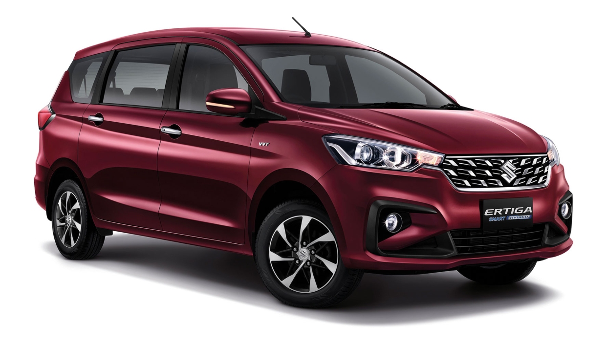 SUZUKI ERTIGA SMART HYBRID (ซูซูกิ แอร์ติกา สมาร์ท ไฮบริด) รถอเนกประสงค์ เบาะ 3 แถว 7 ที่นั่ง เครื่องยนต์เบนซิน ความจุ 1.5 ลิตร พ่วงมอเตอร์ไฟฟ้ากับแบทเตอรีลิเธียม-ไอออน 12 โวลท์ ให้กำลัง 105 แรงม้า เกียร์อัตโนมัติ 4 จังหวะ ขับเคลื่อนล้อหน้า