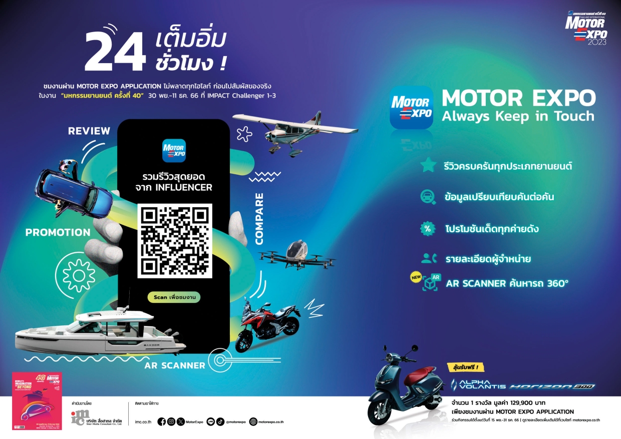ชมรีวิวรถยนต์ รถจักรยานยนต์ ที่จัดแสดงในงาน และลงทะเบียนร่วมสนุก ผ่าน MOTOR EXPO APPLICATION ลุ้นรับ รถจักรยานยนต์ ALPHA VOLANTIS รุ่น HORIZON300 มูลค่า 129,900 บาท จำนวน 1 รางวัล ตั้งแต่วันที่ 15 พฤศจิกายน-31 ธันวาคม 2566