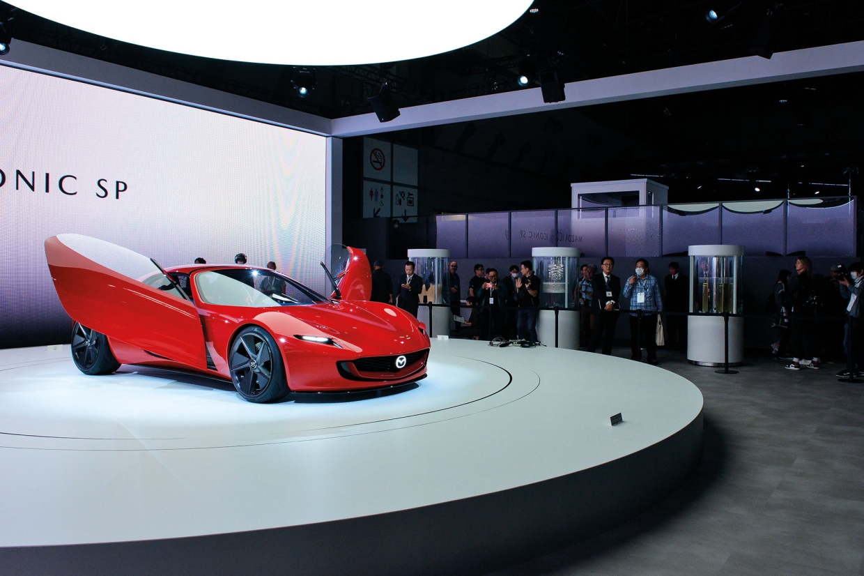 จุดดึงดูดสายตาในบูธของยักษ์เล็กเมืองปลาดิบมีอยู่หลายจุด แต่จุดที่สมควรนำเรื่องราวมาเล่าสู่กันฟังมีอยู่เพียงจุดเดียว คือ MAZDA ICONIC SP (มาซดา ไอโคนิค เอสพี) ที่เห็นในภาพใหญ่ และภาพเล็กซ้ายมือ เป็นรถแนวคิดในรูปลักษณ์ของรถสปอร์ทขนาดเล็กตัวถังประตูปีกนก ซึ่งปรากฏตัวให้เห็นแบบ “ครั้งแรกในโลก” ที่งานนี้ และเชื่อกันในญี่ปุ่นว่า นี่คือแม่แบบของรถ MAZDA ROADSTER (มาซดา โรดสเตอร์) รุ่นใหม่ (รุ่นที่ 5) ซึ่งอีกไม่นานนักจะเริ่มการจำหน่าย อยู่ในตัวถังขนาด 4.180x1.850x1.150 ม. ซึ่งมีน้ำหนักรถเปล่า 1,450 กก. ติดตั้งระบบขับด้วยพลังไฟฟ้าที่ค่ายนี้พัฒนาขึ้นเอง และตั้งชื่อว่า 2- ROTOR ROTARY-EV SYSTEM เป็นระบบที่สามารถใช้เชื้อเพลิงได้หลายชนิดรวมทั้งแกสไฮโดรเจน ให้กำลังสูง 272 กิโลวัตต์/370 แรงม้า มีขนาดเล็กกะทัดรัด การออกแบบโครงสร้างตัวรถจึงทำได้อย่างอิสระเสรี มีศูนย์กลางความถ่วงอยู่ต่ำ และกระจายน้ำหนักลงสู่ล้อในอัตราสมบูรณ์แบบ คือ 50:50