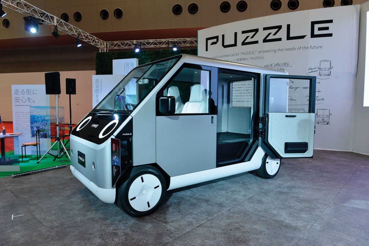 HWE PUZZLE (เอชดับเบิลยูอี พัสเซิล) ผลงานของบริษัทรถยนต์ญี่ปุ่น HW ELECTRO COMPANY LIMITED ซึ่งก่อตั้งเมื่อปี 2020 เป็นรถแนวคิดซึ่งเป็นแม่แบบของรถเพื่อการพาณิชย์ขนาดมีนีที่ค่ายนี้ตั้งใจจะนำออกสู่ตลาดในฤดูใบไม้ผลิปี 2025 ตัวถังซึ่งมีขนาดตามข้อกำหนดของรถมีนีเมืองปลาดิบ คือ 3.395x1.475x1.918 ม. และมีช่วงฐานล้อยาว 2.476 ม. ออกแบบโดยเน้นพื้นที่บรรทุก จึงติดตั้งเก้าอี้ที่นั่งเพียงแถวเดียว ยังไม่มีการเปิดเผยรายละเอียดของระบบขับ แต่ให้ข้อมูลว่า เป็นรถพลังไฟฟ้าล้วนๆ ที่สามารถป้อนกระแสไฟฟ้าให้แก่อุปกรณ์ไฟฟ้านอกตัวรถได้ในกรณีฉุกเฉิน สามารถทำหน้าที่เป็นจุดให้บริการ WI-FI สาธารณะ รวมทั้งเป็นแหล่งป้อนกระแสไฟฟ้าขนาดเล็กกรณีเกิดภัยธรรมชาติต่างๆ อีกต่างหาก ตัวรถออกแบบอย่างง่ายๆ และเน้นเนื้อที่ใช้สอย มีผนังด้านข้างเป็นแผ่นเรียบตั้งแต่หน้ารถจรดท้ายรถ และมีประตูข้างเป็นประตูติดบานพับที่เปิดแยกจากกันโดยมีเสาค้ำยันกลาง