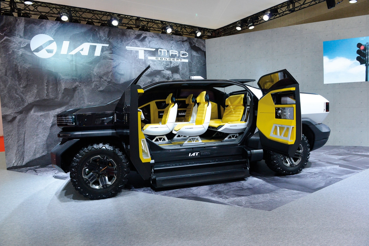 IAT T MAD CONCEPT (ไอเอที ที แมด คอนเซพท์) ผลงานชิ้นโบว์แดงของบริษัท IAT AUTOMOTIVE TECHNOLOGY INC. ผู้ชำนาญการให้คำปรึกษาด้านออกแบบ และพัฒนายานยนต์ของสาธารณรัฐประชาชนจีน เป็นรถแนวคิดในรูปลักษณ์ของรถพิคอัพขนาดยักษ์ หน้าตาดิบๆ เถื่อนๆ สไตล์เดียวกันกับรถ GMC HUMMER EV PICKUP (จีเอมซี ฮัมเมอร์ อีวี พิคอัพ) ของยักษ์ใหญ่เมืองมะกัน ปรากฏตัวครั้งแรกที่งานมหกรรมยานยนต์กวางโจว เมื่อตอนต้นปี และฉายซ้ำอีกครั้งที่งานนี้ ห้องโดยสาร 4 ประตู 5 ที่นั่ง ติดตั้งเก้าอี้ที่นั่งในลักษณะที่ไม่เหมือนกับรถคันใดในโลก คือ 1+2+2 เฉพาะเก้าอี้ตัวหน้าสามารถหมุนได้ 180 องศา เก้าอี้แถว 2 หมุนได้ 90 องศา ส่วนแถว 3 เป็นเก้าอี้แบบม้ายาว ระบบขับใช้มอเตอร์ไฟฟ้า 2 ชุด โดยชุดหนึ่งขับล้อคู่หน้า อีกชุดหนึ่งขับล้อคู่หลัง ได้กำลังสูงสุด 600 กิโลวัตต์/805 แรงม้า และส่งกำลังสู่ล้อซึ่งมีขนาดโตถึง 38 นิ้ว ผ่านระบบเกียร์อัตโนมัติจังหวะเดียว
