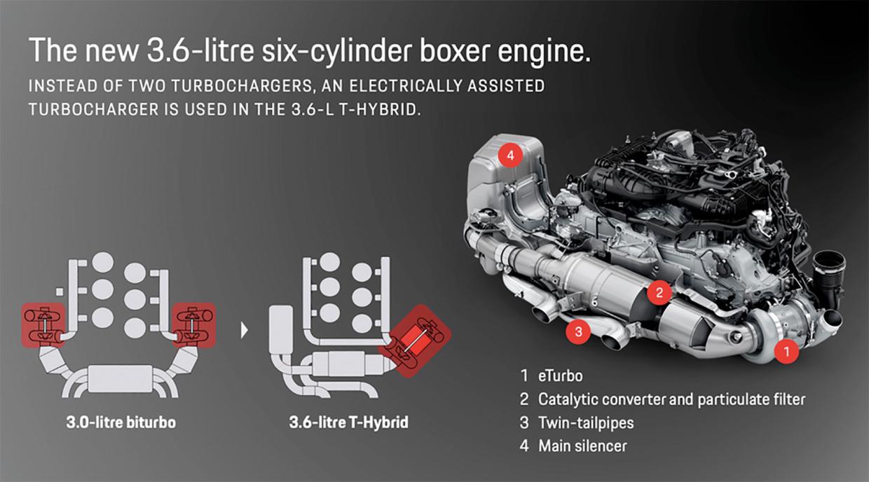 ค่าย PORSCHE ใช่ว่าไม่เคยมีรถไฮบริดมาก่อน แต่นี่คือครั้งแรกสำหรับรถสปอร์ทเรือธงของค่ายอย่าง 911 ที่ใช้เครื่องยนต์ 6 สูบนอนยันวางด้านท้าย ซึ่งเราจะมาศึกษาว่า พวกเขาใส่ความคิดอะไรไปกับขุมพลัง และระบบขับเคลื่อนของรถรุ่นใหม่ ที่พวกเขาเรียกว่า ระบบ T-HYBRID (ที-ไฮบริด) โดยเราจะพิจารณาไปที่ 3 หัวข้อ คือ 1. แนวคิดของเครื่องยนต์รุ่นใหม่ 2. แนวคิดของระบบส่งกำลัง และ 3. แนวคิดของระบบไฟฟ้า