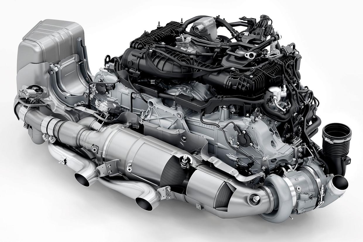 เริ่มกันที่หัวข้อแรก เครื่องยนต์บลอคใหม่นี้ใช้รหัส 9A3B6 มาแทนที่เครื่องยนต์รหัส 9A2B6 ความจุ 3.0 ลิตร (2,981 ซีซี) พร้อมเทอร์โบคู่ ซึ่งดูจากรหัสน่าจะพอเดาได้ว่า B6 = BOXER 6 หรือ 6 สูบบอกเซอร์ โดยมีการขยายความจุกระบอกสูบเพิ่มเป็น 3.6 ลิตร (3,591 ซีซี) แต่จะลดจำนวนเทอร์โบเหลือเพียงตัวเดียว และเป็นเทอร์โบที่มีแกนเป็นมอเตอร์/เครื่องปั่นไฟ