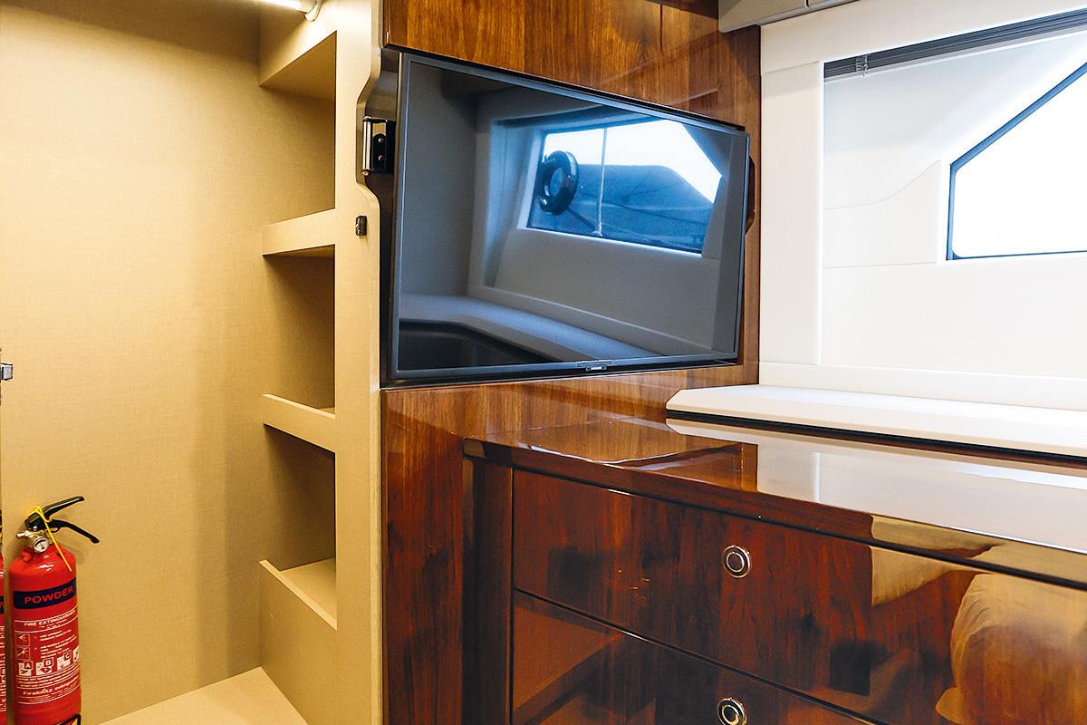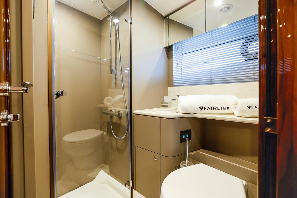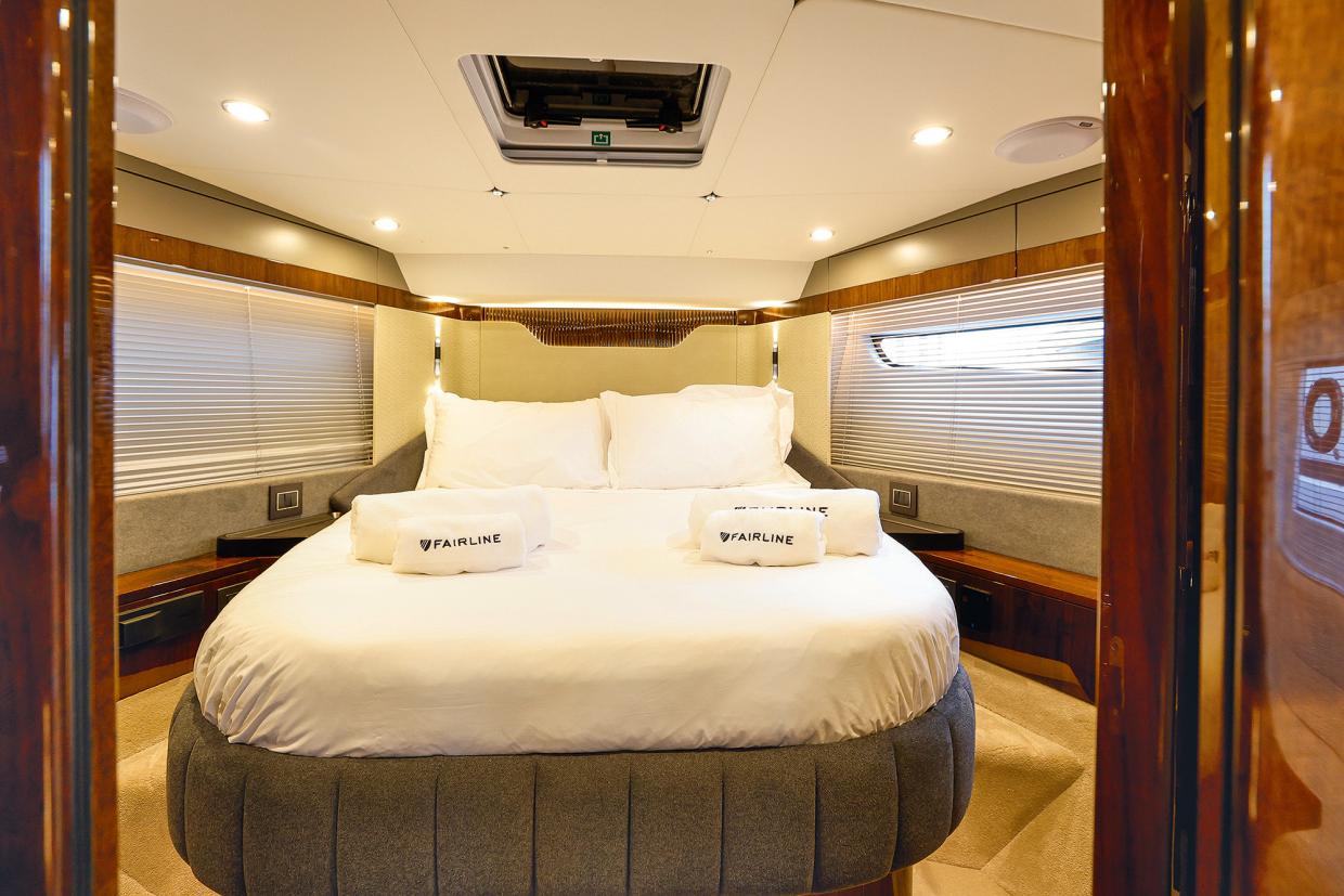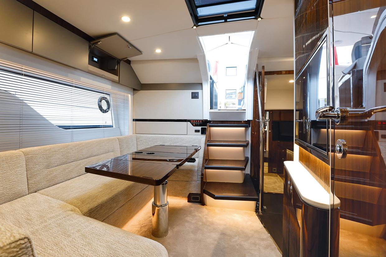 สำหรับการตกแต่งภายใน ตัวเลือกการเคลือบผิววอลนัทเงา ซึ่งยังคงได้รับความนิยมในเรือ FAIRLINE ประมาณ 80 % อาจให้ความรู้สึกเหมือนเรือยอชท์แบบดั้งเดิม แต่แน่นอนว่ายังมีตัวเลือกการตกแต่งด้วยไม้โอคสีอ่อนในแบบด้าน และซาตินสำหรับผู้ที่ชื่นชอบสไตล์นอร์ดิคสมัยใหม่ และไม่ว่าอย่างไรก็ตาม การใช้ไม้ลายเส้น เนื้อผ้าที่มีสีอ่อน ผิวสัมผัสที่หลากหลาย และการจัดแสงที่ชาญฉลาดของ FAIRLINE ก็ทำให้การใช้ผิวเคลือบโทนมืดนี้ ให้ความรู้สึกประทับใจอย่างน่าประหลาด