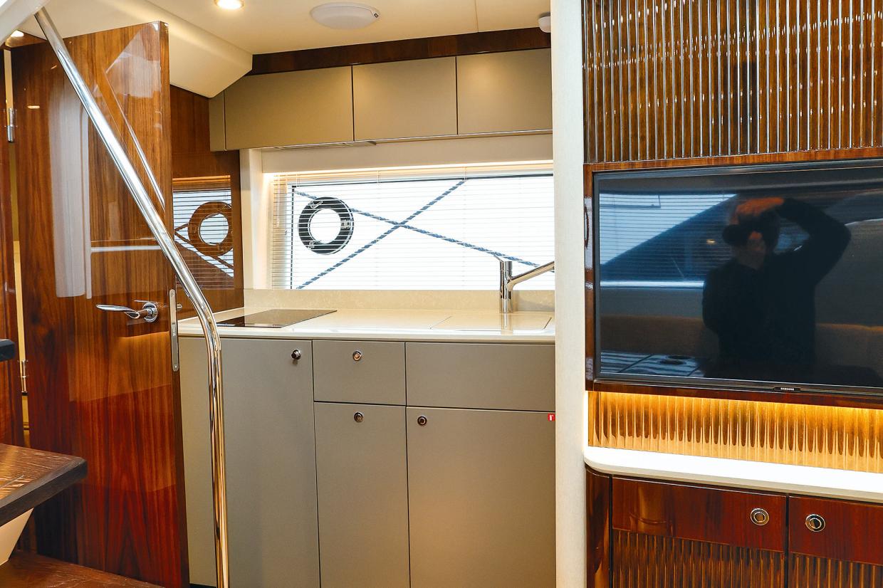 จากจุดนี้ เมื่อคุณเคลื่อนตัวไปด้านหน้า จะพบกับบาร์เปียกที่กราบขวา พร้อมสิ่งอำนวยความสะดวกครบครัน มีทั้งช่องน้ำแข็งระบายน้ำคู่ที่อยู่ด้านหน้าของอ่างล้างจาน และเตาย่าง ส่วนบริเวณกราบซ้าย ตรงข้ามกับห้องบังคับเรือ ก็ถูกออกแบบมาอย่างลงตัว โดยขอบหน้าของที่นั่งรับประทานอาหารจะถูกยกขึ้น เพื่อเพิ่มที่นั่ง และพื้นที่ใช้สอยด้านล่าง ให้มากกว่าเรือลำอื่นๆ ที่มีขนาดใกล้เคียงกัน