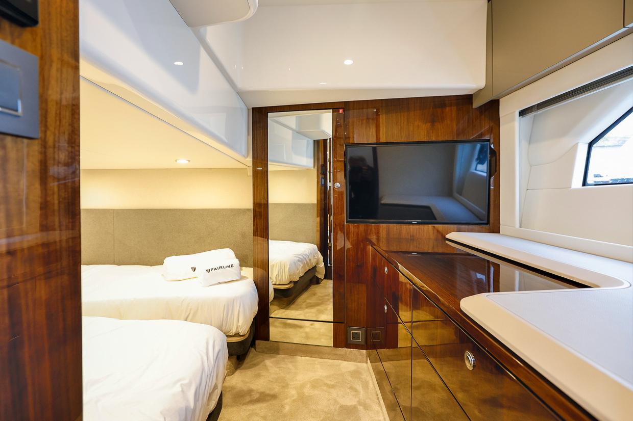 TARGA 40 มาพร้อมห้องด้านหน้าสำหรับเจ้าของเรือ ห้องกลางที่มีเตียงคู่ ซึ่งสามารถปรับรวมเป็นเตียงเดี่ยวได้ และห้องน้ำ 1 ห้องที่มีห้องอาบน้ำแยกต่างหาก แม้จะมีพื้นที่มากพอในห้องนั่งเล่นแบบเปิด ที่จริงแล้วเอามาสร้างห้องโดยสารเตียงเดี่ยวเพิ่มตรงกราบขวาได้ แต่ FAIRLINE ไม่สนใจจะทำแบบนั้น เพราะไม่ต้องการแข่งขันกับ TARGA 45 ซึ่งเป็นรุ่นที่ใหญ่กว่า ดังนั้น หากคุณต้องการล่องเรือกับเพื่อนๆ 6 คน คุณอาจต้องลงทุนเพิ่มอีก 7,950 ปอนด์ เพื่อซื้อโต๊ะพับเสริมที่สามารถแปลงที่นั่งรับประทานอาหารให้กลายเป็นเตียงหลังที่ 3 ได้