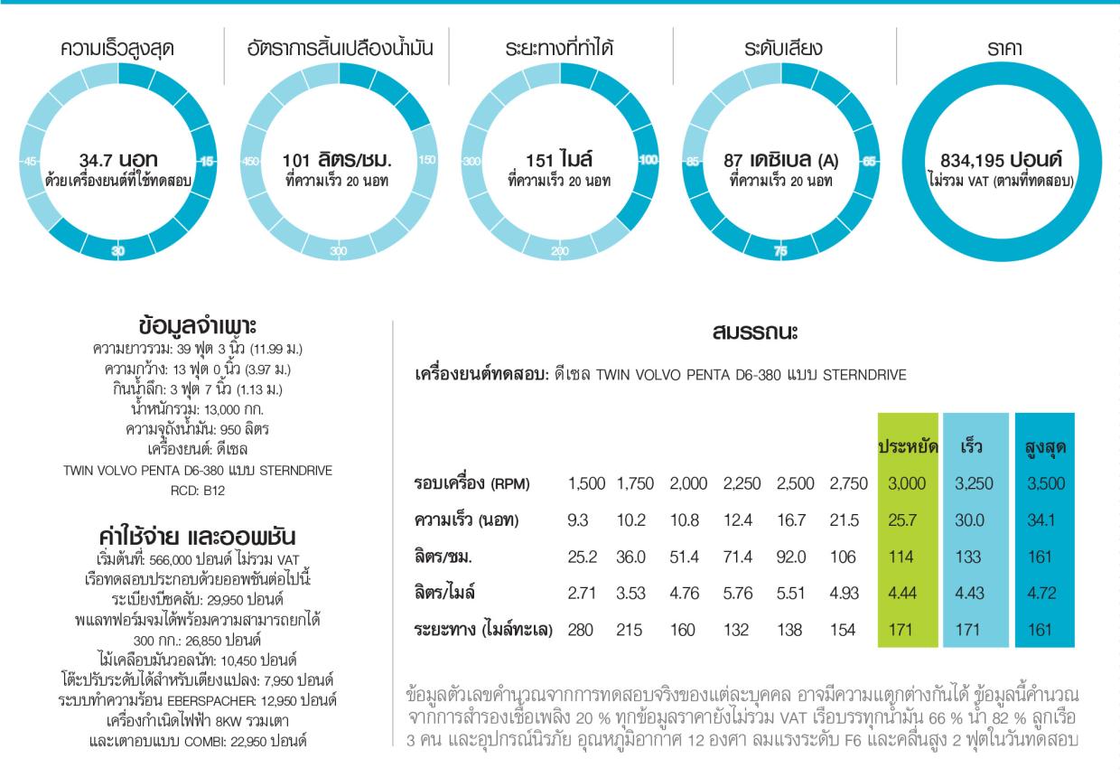 ด้วยน้ำหนักรวมมากกว่า 13 ตัน เรือที่สร้างอย่างแข็งแรง และติดตั้งทุก อย่างครบครันนี้ จึงไม่ถูกนับเป็นเรือเบา และด้วยการมีตัวเลือกเครื่องยนต์สูงสุด เป็นดีเซลคู่ 380 แรงม้า เมื่อคุณเร่งเครื่อง สิ่งที่คุณจะได้สัมผัส คือการเคลื่อนที่ในลักษณะของเรือครูส มากกว่าเรือสปอร์ทที่เบา การเร่งผ่านความเร็ว 9-12 นอท จะเพิ่มอัตราการใช้น้ำมันจาก 2.7 เป็น 5.7 ลิตร/ไมล์ แต่คุณสามารถแก้ไขการเอียงด้านหน้าของเรือขณะเร่งเครื่องได้ง่ายๆ เพียงปรับแทบลงประมาณ 20 % เมื่อควบคุมเรือแบบนี้ การเร่งจะรวดเร็ว ราบเรียบ และน่าพอใจ และเมื่อคุณไปถึงความเร็วเกิน 22 นอท ประสบการณ์ก็จะยิ่งดีขึ้นอีก