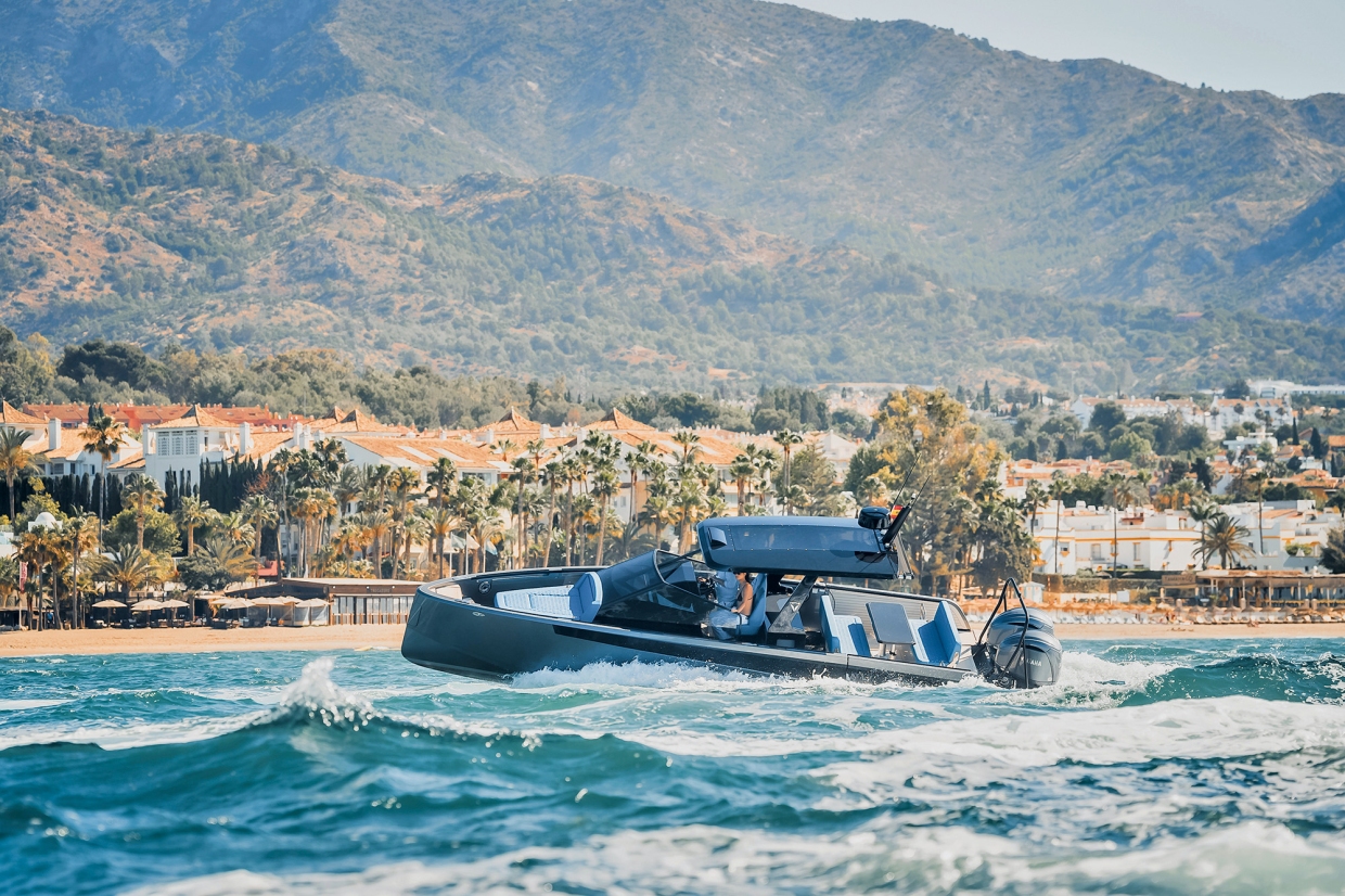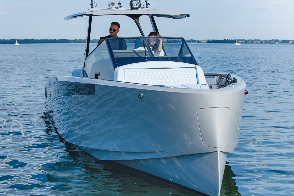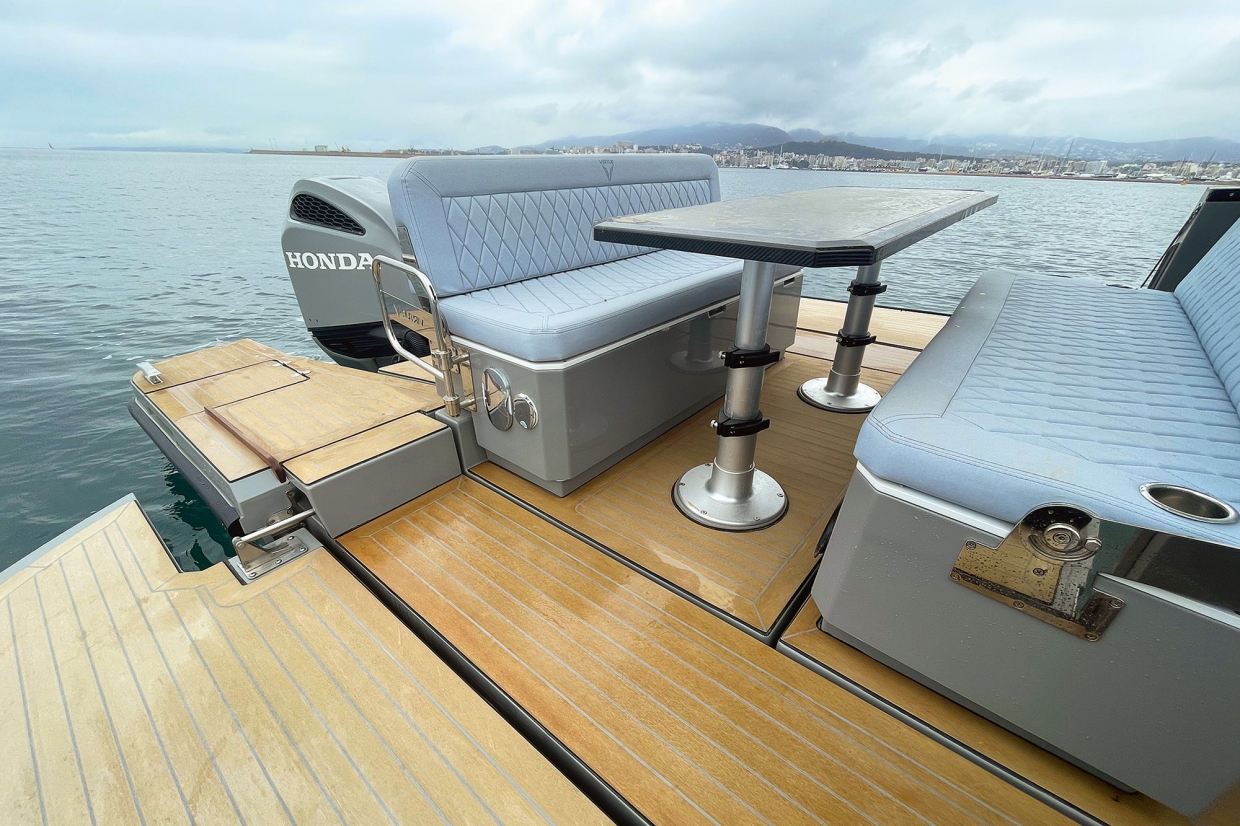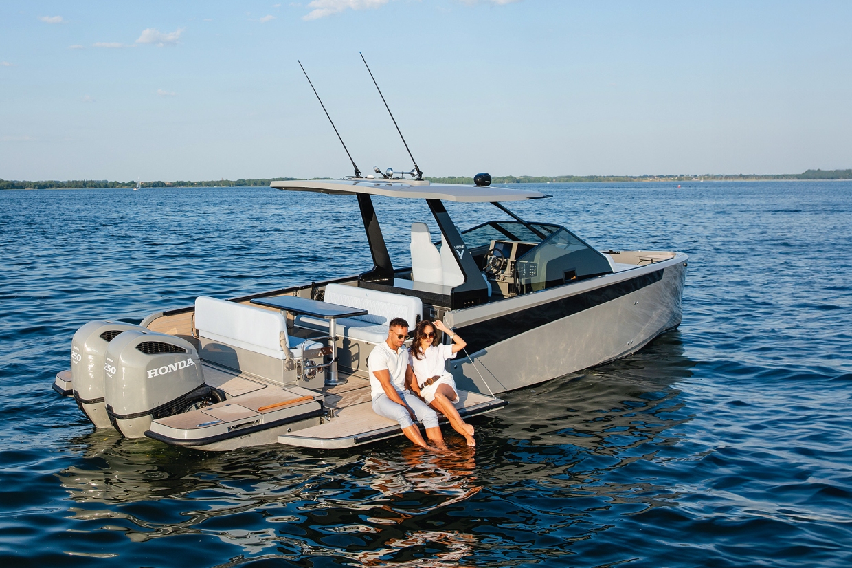 คุณจะนึกชื่อผู้ผลิตเรือที่มีดีไซจ์นลักษณะนี้ได้มากมาย ตั้งแต่ RYCK, STERK, QUARKEN และ SAXDOR ไปจนถึง AXOPAR, PARDO, FJORD และ SCHAEFER ตลาดในกลุ่มนี้มีตัวเลือกหลากหลาย แต่กลับมีการออกแบบที่แตกต่างกันชัดเจนอยู่เพียงน้อยนิด สิ่งที่เราเคยเห็น (และมักคาดหวัง) คือ หัวเรือที่ตั้งตรง ห้องโดยสารขนาดเล็กสำเร็จรูป ดาดฟ้าแบบ WALKAROUND และเครื่องยนต์ OUTBOARD นอกจากนี้ ยังมีห้องนั่งเล่นด้านท้ายเรือพร้อมที่นั่งแบบหันหน้าเข้าหากัน บาร์เปียกทรงขวาง และพื้นที่บังคับเรือสำหรับ 2-3 คน ซึ่งเป็นมาตรฐานทั่วไป ตัวเลือกที่นิยมมักรวมถึง T-TOP และระเบียงพับขยายพื้นที่ด้านท้าย