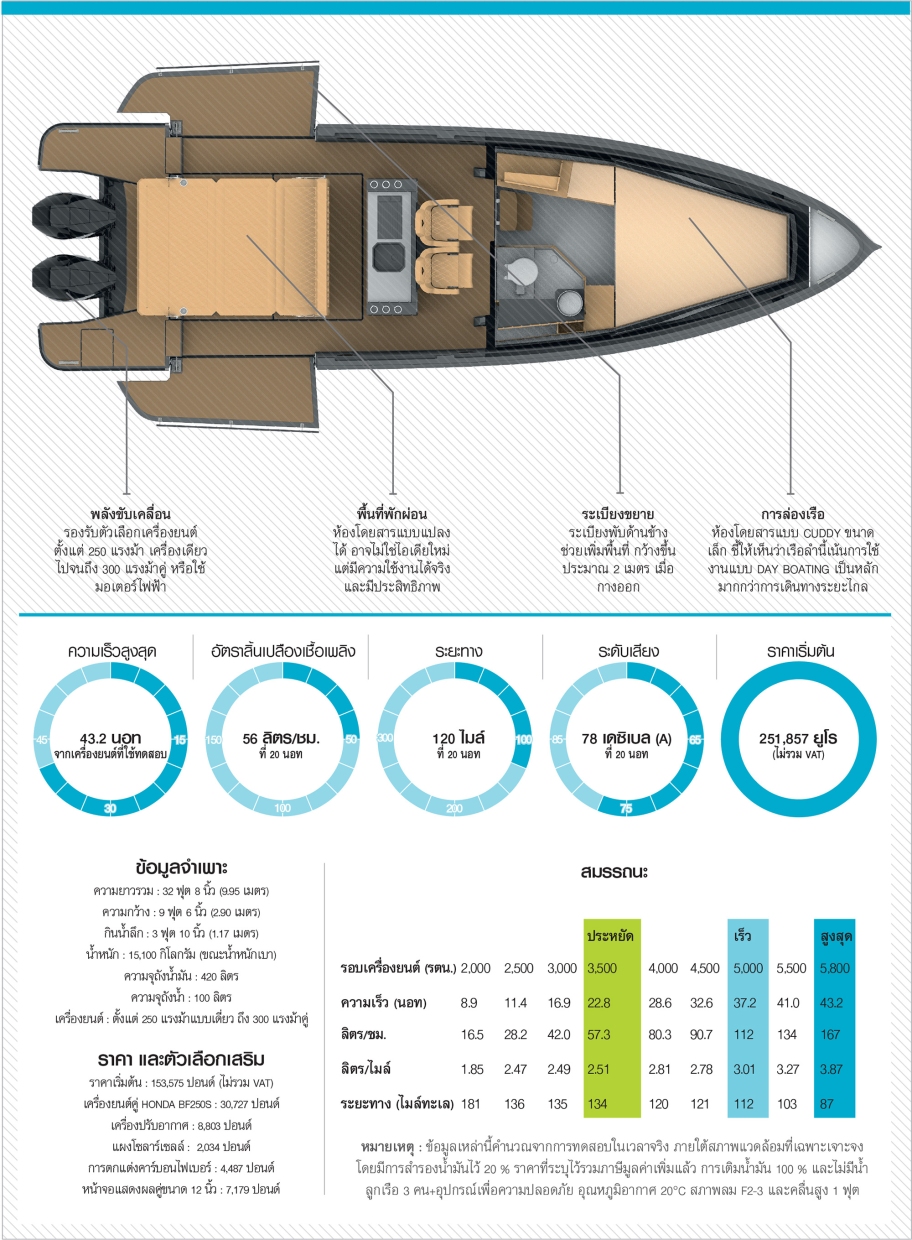 ด้วยชุดเครื่องยนต์แบบนี้ คุณอาจลดอัตราการสิ้นเปลืองน้ำมันที่ความเร็วเดินเรือลงได้ประมาณ 30 ลิตร/ชั่วโมง และที่ความเร็วสูงสุดลดลงได้ถึง 60 ลิตร/ชั่วโมง แต่ยังคงทำความเร็วได้สูงถึง 30 นอท