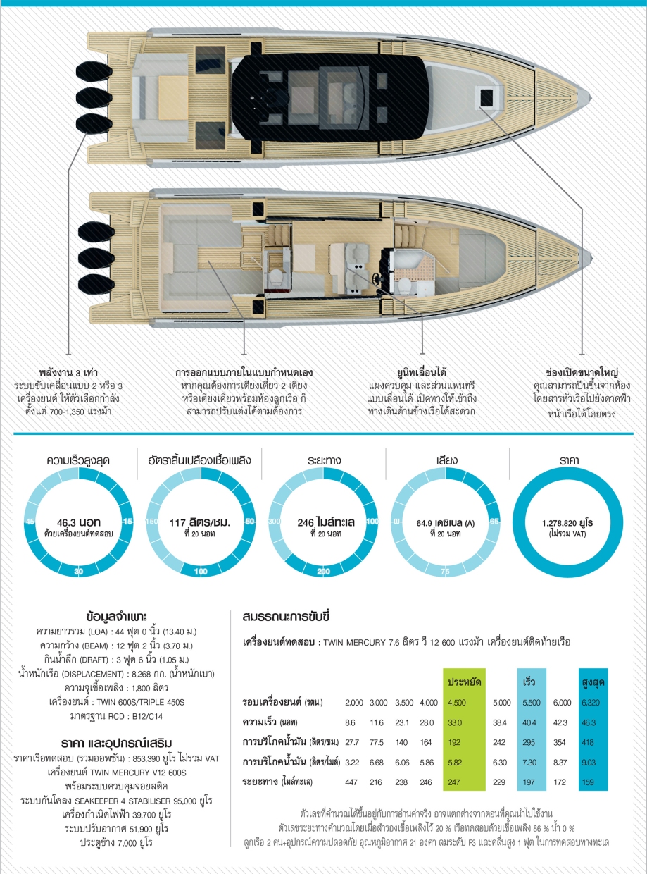 ด้วยเครื่องยนต์ MECURY 600 คู่ที่ติดตั้งอยู่ท้ายเรือ EXPLR 44 ทำงานได้อย่างเงียบจนน่าทึ่ง ระดับเสียงที่วัดได้ที่ความเร็วเรือขณะลอยตัวอยู่ที่เพียง 45-50DB ซึ่งเงียบพอๆ กับเสียงฮัมของตู้เย็น แม้เมื่อเพิ่มความเร็วขึ้นสู่ระดับ CRUISING SPEED ระดับเสียงก็เพิ่มขึ้นเพียงช่วง 60DB กลางๆ และที่ความเร็วสูงสุด 46 นอท ระดับเสียงอยู่ที่ประมาณ 73DB ซึ่งยังคงให้ประสบการณ์การเดินทางที่เงียบสงบ ด้านอัตราสิ้นเปลืองเชื้อเพลิงของ EXPLR 44 ก็ให้ผลลัพธ์ที่น่าสนใจไม่แพ้กัน เมื่อเพิ่มรอบเครื่องจาก 3,000 เป็น 3,500RPM ความเร็วของเรือ จะเพิ่มขึ้นเท่าตัว จาก 11.5 เป็น 23 นอท แต่ที่น่าทึ่งกว่านั้น คือ อัตราสิ้นเปลืองเชื้อเพลิงกลับลดลง จาก 6.7 ลิตร/ไมล์ทะเล เหลือ 6.1 ลิตร/ไมล์ทะเล ซึ่งเป็นผลมาจากการที่เครื่องยนต์ MECURY 600 ทำงานได้อย่างมีประสิทธิภาพเมื่อเข้าสู่ช่วงเกียร์สูง