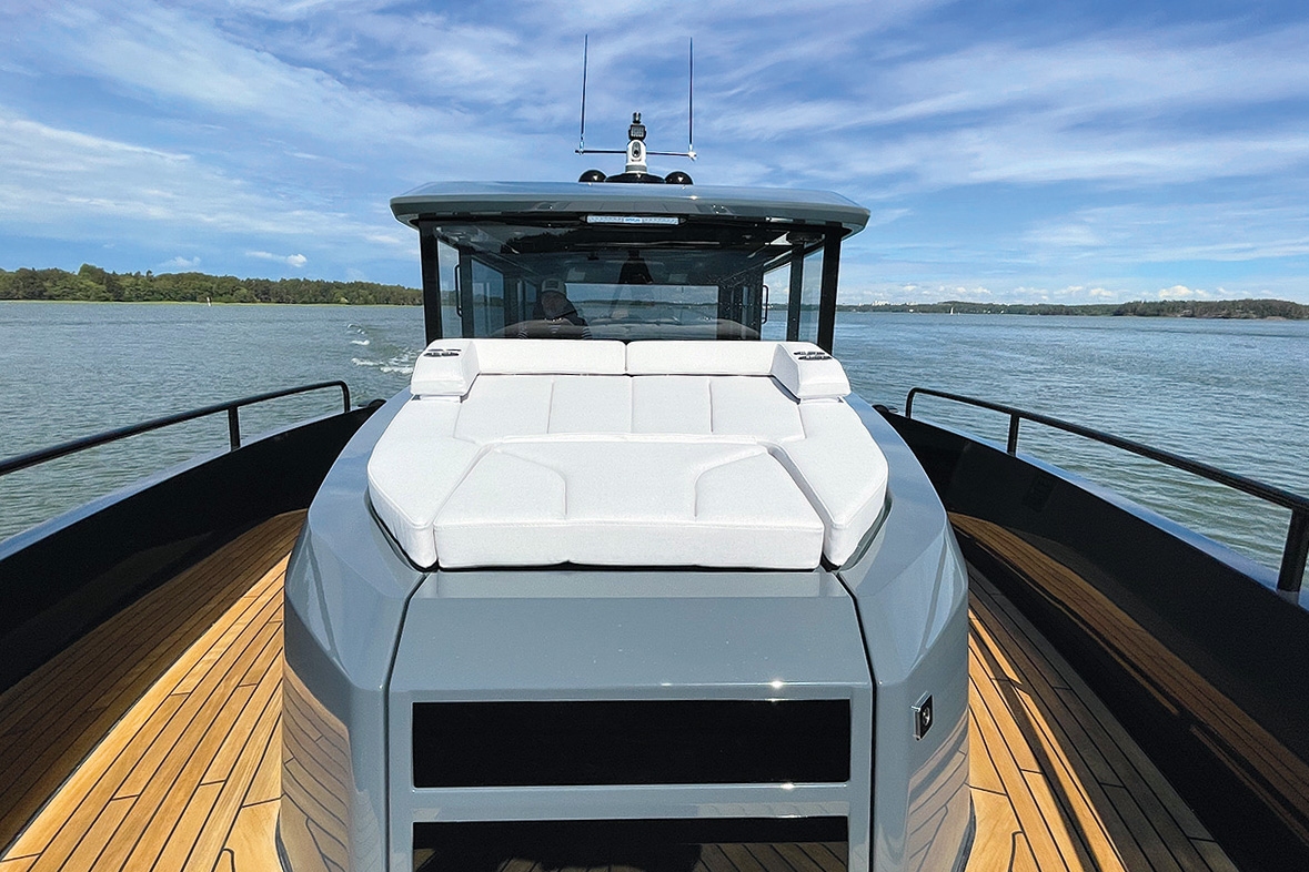 ห้องโดยสารด้านหน้าใช้แนวคิดเดียวกับ DFNDR 9 ซึ่งได้รับรางวัลมาแล้ว ภายในมีเตียงคู่รูปตัว V ที่หัวเรือ พร้อมทางเข้าดาดฟ้าสำหรับอาบแดด ผ่านช่องเปิดแบบบานพับที่ติดตั้งอยู่ใต้เบาะอาบแดดด้านหน้า ใต้เตียงมีช่องเก็บของบุไม้อัด ที่สามารถใช้เก็บสัมภาระได้โดยไม่กระทบกับ BOW THRUSTER หรือแบทเตอรี ด้านหลังเตียงมีตู้เก็บของทางกราบซ้าย และที่นั่งเปลี่ยนเสื้อผ้าทางกราบขวา รวมถึงห้องน้ำสไตล์ WETROOM ที่มาพร้อมประตูฝักบัวแบบอัจฉริยะ ซึ่งช่วยแบ่งพื้นที่ใช้งานให้เป็นสัดส่วน