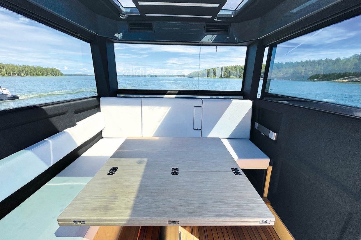 ในรูปแบบปัจจุบัน ห้องโดยสารนี้ให้ความรู้สึกโปร่งสบายด้วยสกายไลท์และช่องเปิดที่เชื่อมไปยังดาดฟ้าด้านท้าย รวมถึงหน้าต่างแนวยาวที่ให้มุมมองผ่านเครื่องยนต์นอกเรือของ MERCURY การออกแบบนี้ทำให้ต้องจัดสรรตำแหน่งของระบบต่างๆ ใหม่ ไม่ว่าจะเป็นเครื่องทำความร้อนดีเซล, เครื่องปรับอากาศ, ระบบน้ำร้อน และเครื่องปั่นไฟ ซึ่งส่วนใหญ่ถูกย้ายไปไว้ใต้พื้นห้องควบคุม อย่างไรก็ตาม ระบบกันโคลง SEAKEEPER ยังคงอยู่ในตำแหน่งเดิมที่ตู้ท้าย ระหว่างม้านั่งทั้ง 2 ฝั่ง
