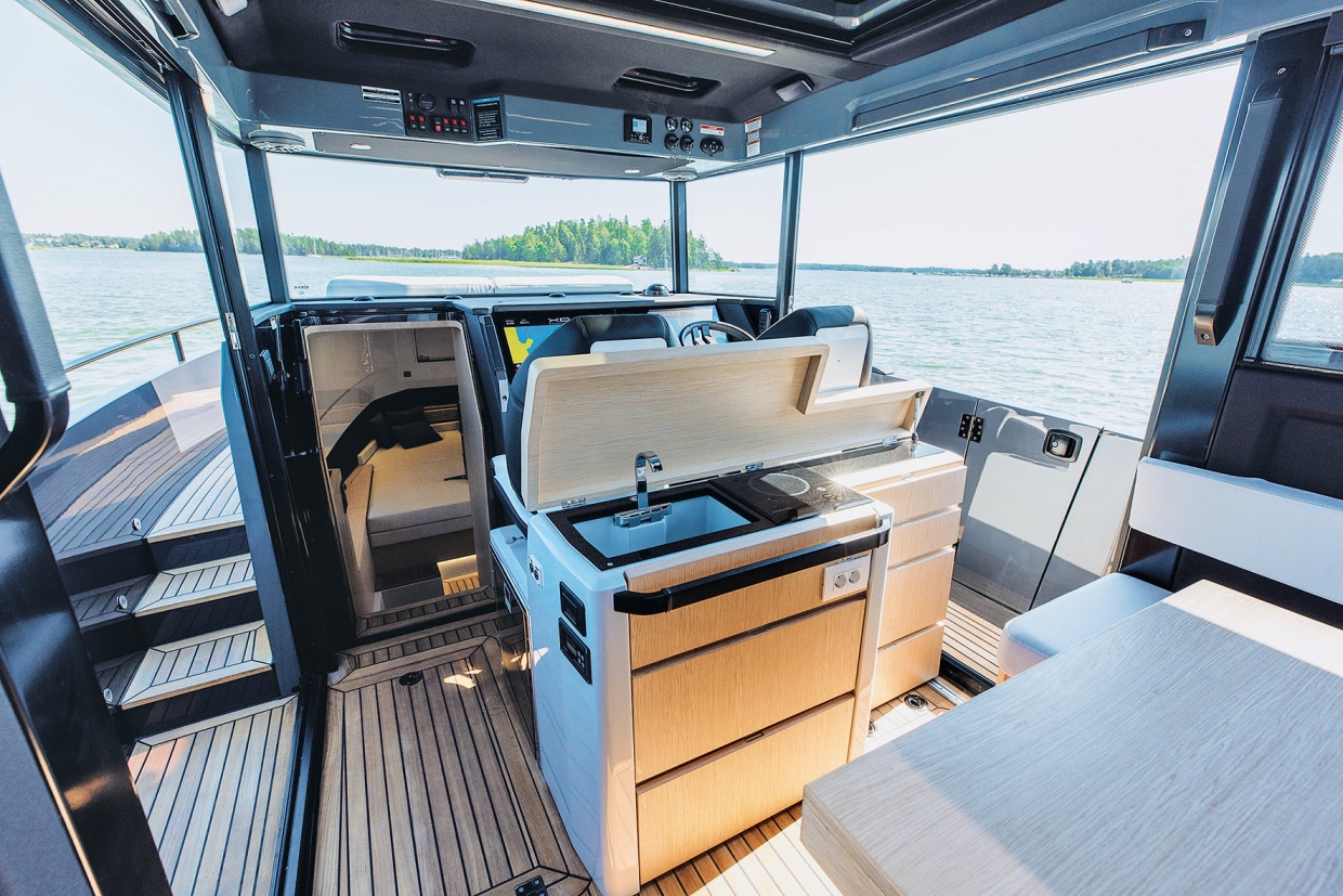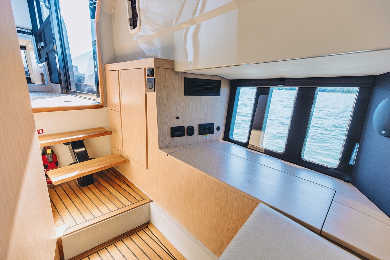 แต่แน่นอนว่าห้องโดยสารด้านท้ายเป็นจุดที่ให้ความรู้สึกสดใหม่ที่สุด สามารถเข้าถึงได้ผ่านเบาะนั่งบานพับทางกราบซ้ายของมุมรับประทานอาหารในห้องควบคุม เมื่อก้าวลงไป คุณจะพบกับโถงทางเข้าแบบเปิดโล่ง เชื่อมต่อไปยังโซนเลาน์จ์ และพื้นที่นอนด้านหลัง ที่นี่มีประตูที่นำไปสู่ห้องน้ำแยกเป็นสัดส่วน และมีหน้าต่างบานใหญ่เพียงบานเดียว ที่ให้มุมมองกว้างออกไปยังดาดฟ้าท้ายเรือ