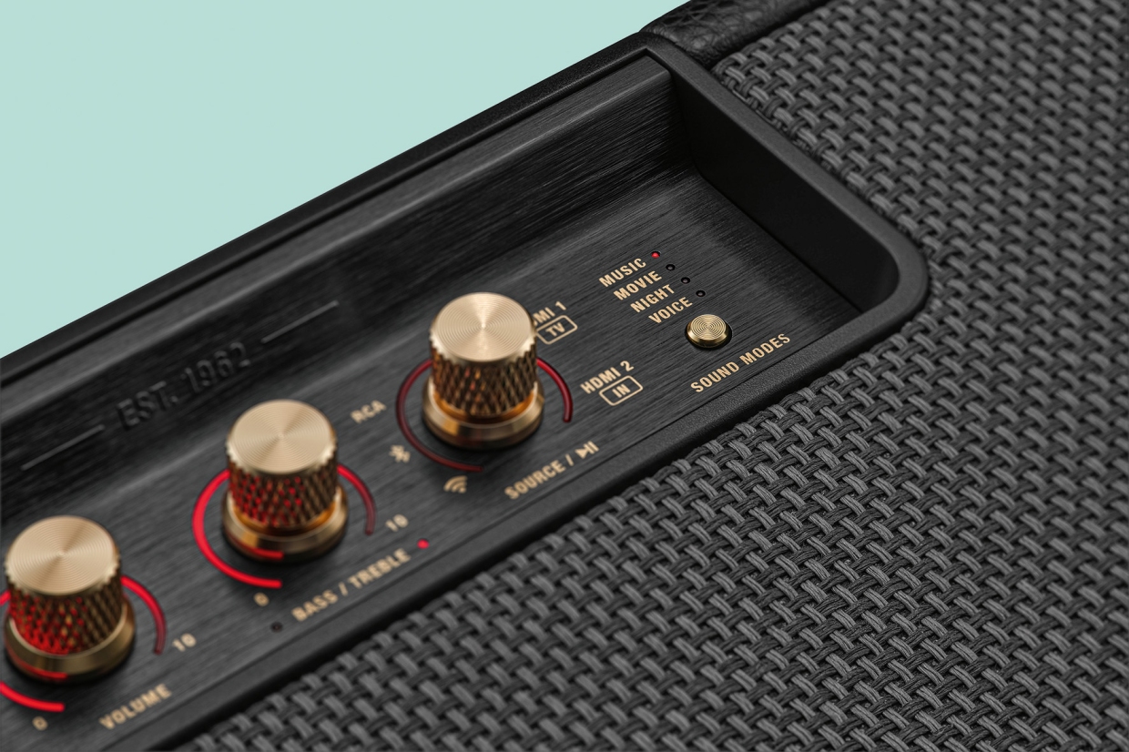 MARSHALL HESTON 120 โดดเด่นด้วยรายละเอียดที่ถูกออกแบบมาอย่างมีเหตุผล ไม่ใช่แค่เพื่อให้ดูแตกต่างเฉยๆ ยกตัวอย่างเช่น ด้านบนของตัวเครื่องมีลูกบิดควบคุม 3 ตัว พร้อม ปุ่มควบคุมหลายแบบ ซึ่งดูเรียบง่าย และไม่รบกวนสายตาเท่าซาวน์ดบาร์บางรุ่นที่ใช้พลาสติคเงาเป็นส่วนบนของตัวเครื่อง