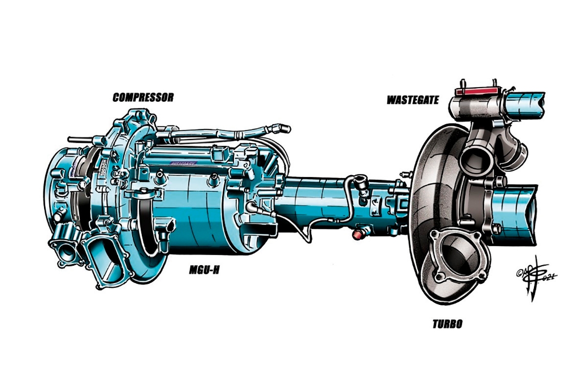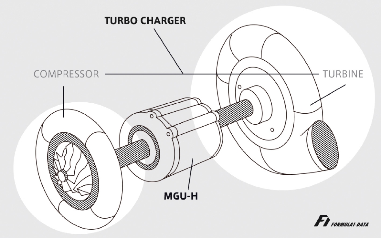 ส่วนระบบ MGU-H หรือ “MOTOR GENERATOR UNIT-HEAT” ที่เป็นเครื่องปั่นไฟ/มอเตอร์ติดตั้งอยู่บนแกนเพลาเชื่อมระหว่างตัวเทอร์โบฝั่งเทอร์ไบน์ และคอมเพรสเซอร์ ถูกยกเลิกการใช้งานไป เพราะไม่คุ้มค่าการลงทุน