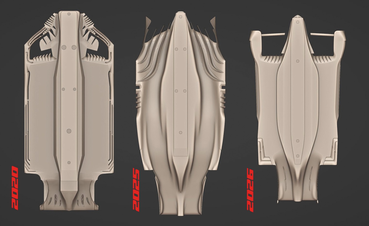 หากพิจารณาจากภาพจะเห็นชัดเจนว่า จากปี 2020 ถึงปี 2025 และเข้าสู่ปี 2026 รูปแบบของใต้ท้องรถจะแตกต่างกัน นั่นคือ ในปี 2020 พื้นรถเป็นแผ่นเรียบธรรมดาที่มีดาวน์ฟอร์ศราว 55 % แต่กติกาปัจจุบัน คือ 2022-2025 พื้นรถได้รับการออกแบบให้มีการควบคุมจัดกระแสการไหลของอากาศเป็นแบบ VENTURI ทำให้มีประสิทธิภาพของแรงดาวน์ฟอร์ศมากถึง 70 % ขณะที่พื้นรถในกติกา 2026 จะเห็นว่า ประสิทธิภาพของแรงดาวน์ฟอร์ศ จากปรากฏการณ์กราวน์ดเอฟเฟคท์ น่าจะน้อยกว่าของปีปัจจุบันมาก