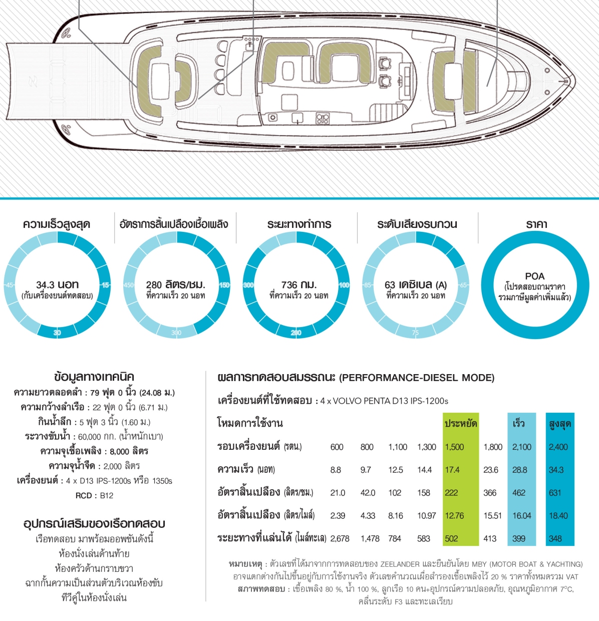 เรือลำนี้กล้าท้าทายด้วยสเปคที่น่าประทับใจสำหรับยอชท์ 80 ฟุตสุดหรู ZEELANDER ระบุว่ามีระยะทางวิ่งได้ถึง 805 กม. ที่ความเร็ว 26 นอท และความเร็วสูงสุดอยู่ที่ 40 นอท ด้วยเครื่อง IPS-1350 รุ่นปรับปรุง พร้อมระดับเสียงไม่เกิน 65 เดซิเบล (A) นอกจากนี้ หากคุณพอใจกับการล่องเรือช้าๆ ที่ 7 นอท ระยะทางยังสามารถเพิ่มไปได้ถึง 4,828 กม. แน่นอนว่าการติดตั้งเครื่อง D13 IPS-1200 แบบ 4 เครื่อง ไม่ใช่เรื่องประหยัดน้ำมันนัก แต่ด้วยถังน้ำมันขนาด 8,000 ลิตร และความจุน้ำ 2,000 ลิตร ทำให้ชัดเจนว่า Z8 ถูกออกแบบมาให้พร้อมสำหรับการล่องเรือระยะยาวโดยไม่ต้องพึ่งสิ่งอำนวยความสะดวกบนฝั่ง