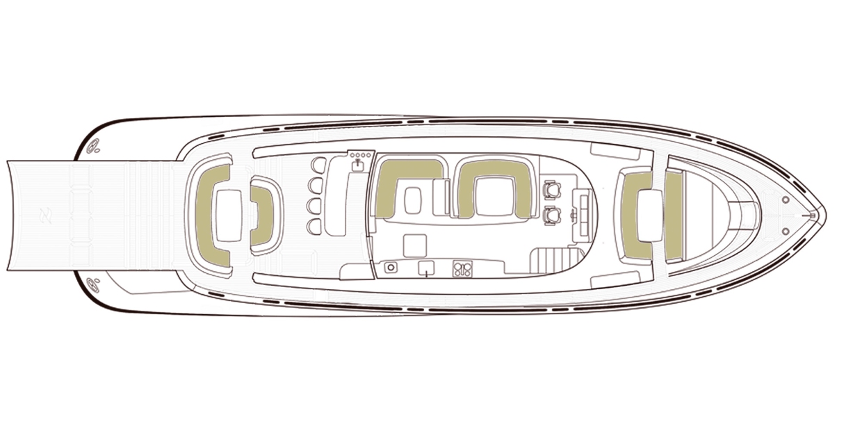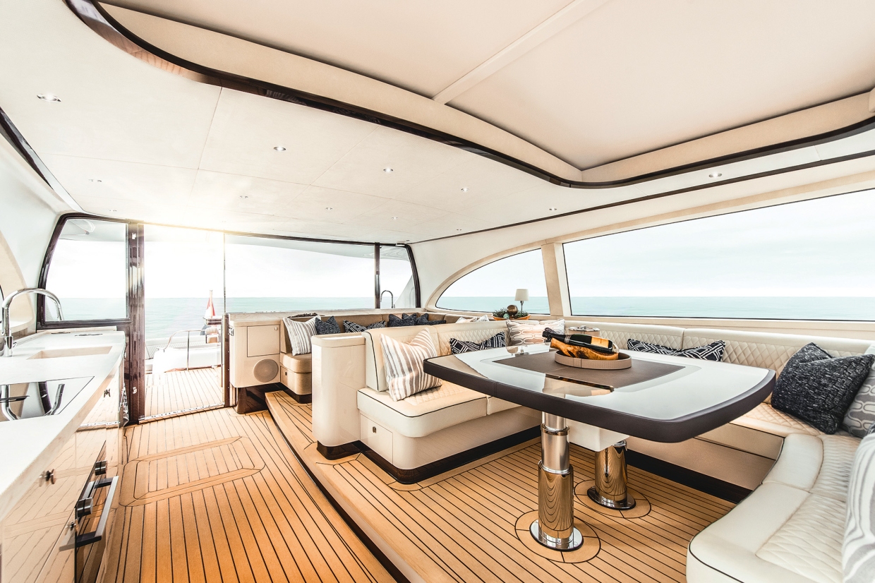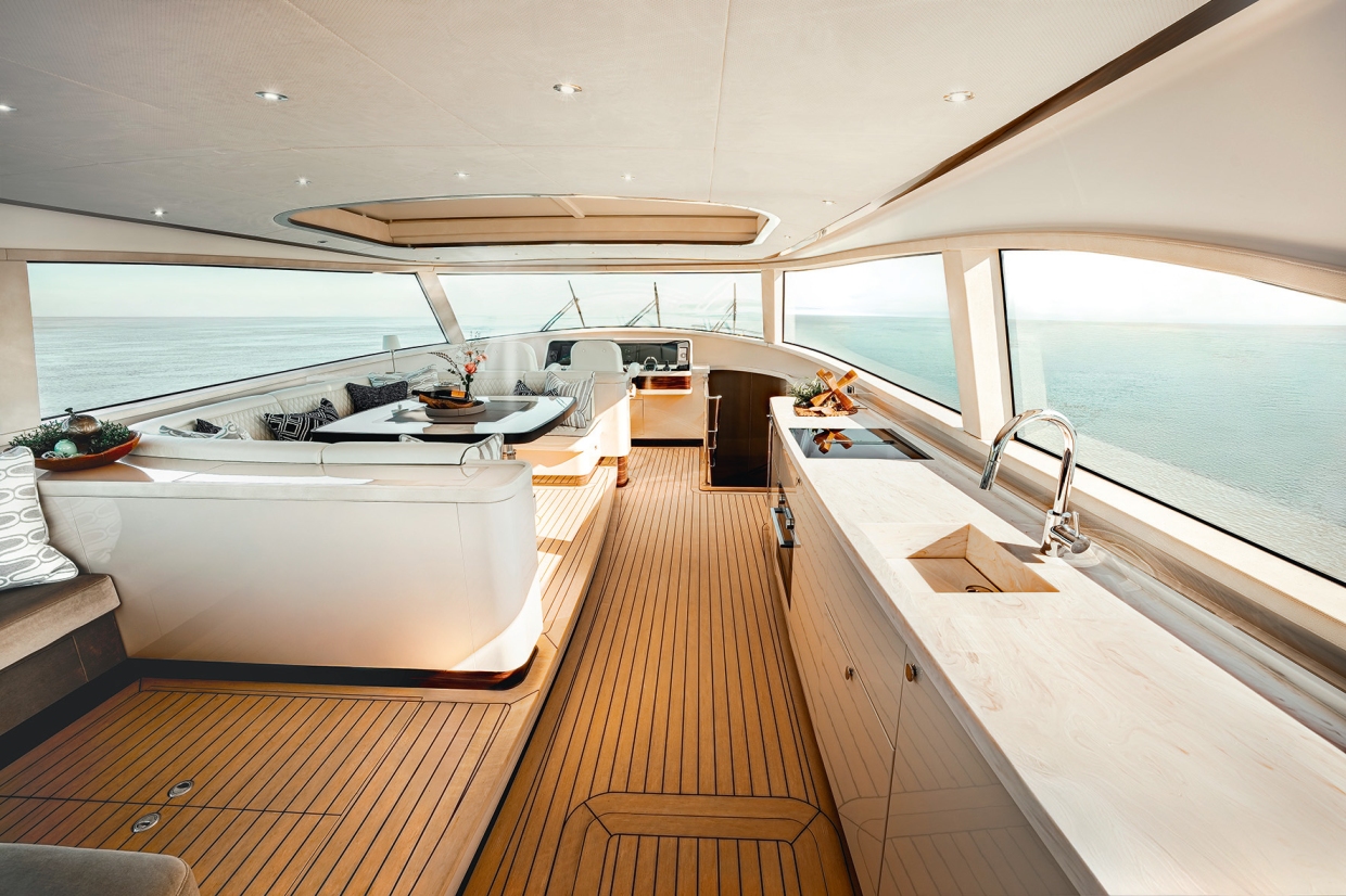 อย่างไรก็ดี มีจุดหนึ่งที่คุณคงไม่อยากให้ใครแตะต้องเลย นั่นคือ ด้านท้ายเรือ อันเป็น TUMBLEHOME TRANSOM ที่กวาดโค้งงดงาม ซึ่งสามารถกางออก และพับลงได้ เพียงกดปุ่มเดียว ก็เพิ่มพื้นที่ดาดฟ้าอีกถึง 130 ตารางฟุต การออกแบบยังใช้ประโยชน์พื้นที่ได้อย่างยอดเยี่ยม บันไดว่ายน้ำไฮดรอลิคขนาดใหญ่พร้อมราวจับในตัวถูกเก็บซ่อนไว้บริเวณกราบซ้าย มีพนักพิง 4 ตัวที่สามารถยกขึ้นจากพื้นดาดฟ้า และปรับระดับได้ตามต้องการ คุณจึงสามารถปูเบาะนอนแทบจะระดับเดียวกับผิวน้ำ และหันหน้าออกสู่ท้ายเรือได้อย่างเต็มอิ่ม นอกจากนี้ ยังมีสะพานทางเดิน ปรับระดับความสูงได้ ซ่อนอยู่ใต้ช่องเก็บทางกราบขวา และหากคุณกังวลเรื่องการเก็บของเล่นทางน้ำ ก็ไม่ต้องห่วง เบาะนั่งท้ายโต๊ะอาหารภายนอกยังยกขึ้น และพับไปข้างหน้า เพื่อเผยพื้นที่เก็บของขนาดใหญ่ที่จัดแบ่งเป็น 3 ส่วนอย่างเป็นระเบียบ