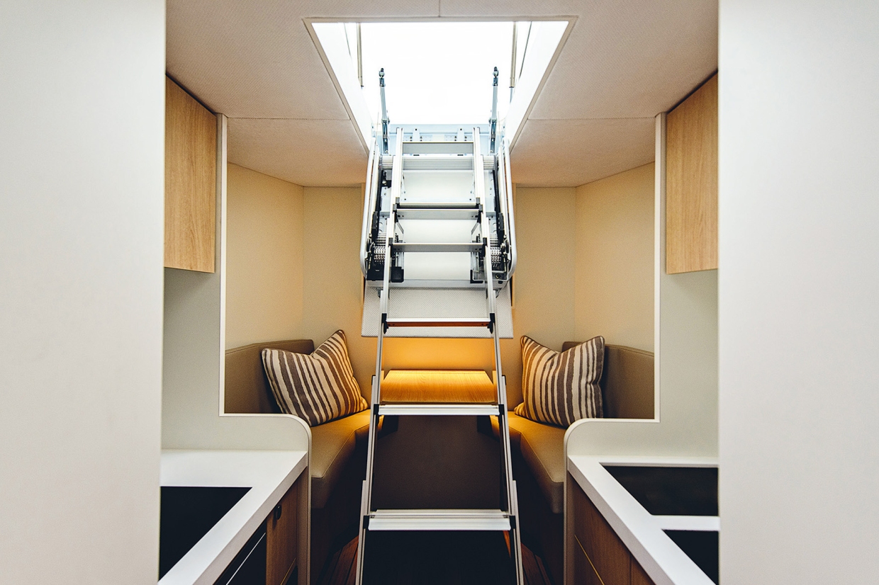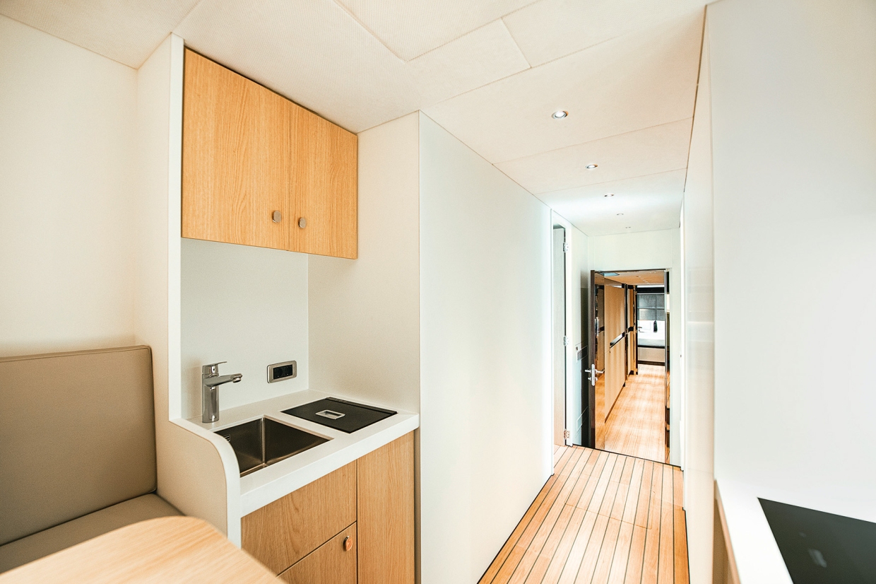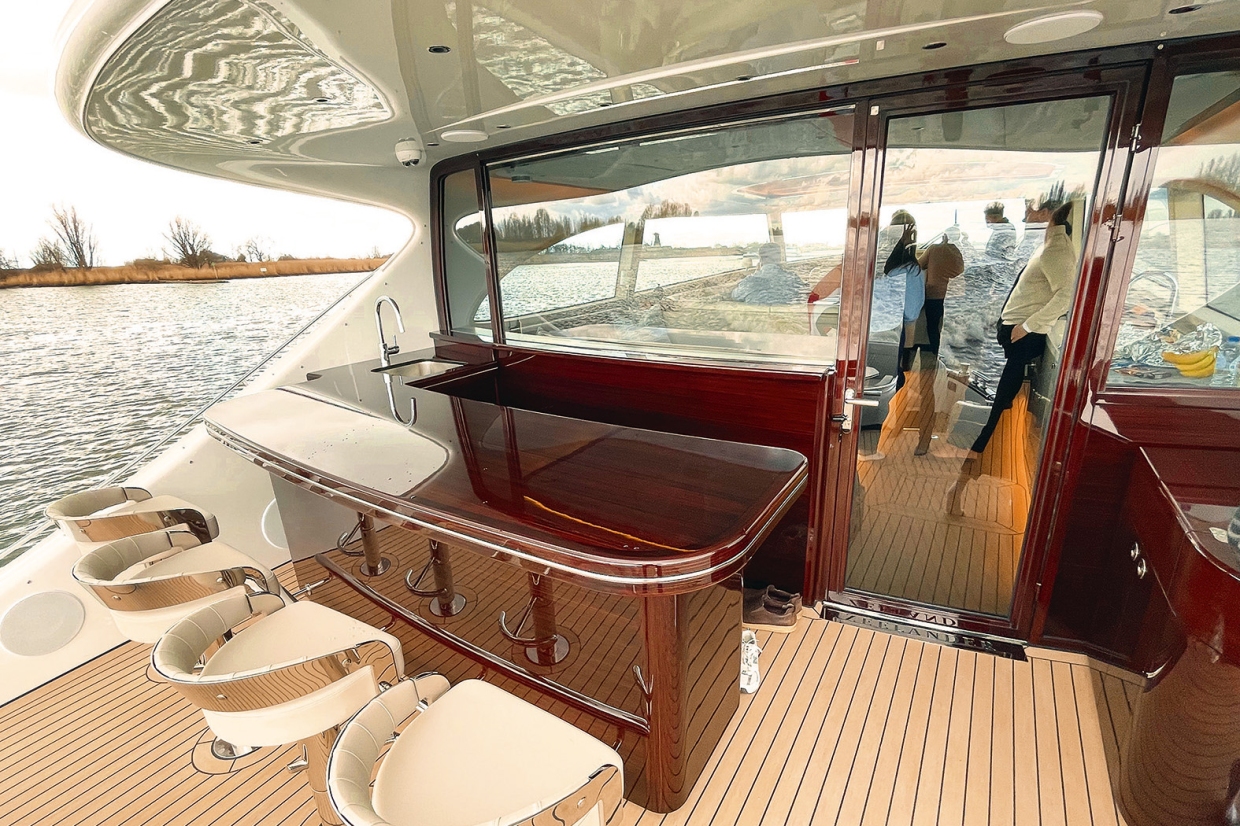 อย่างไรก็ตาม สำหรับเรือทดสอบลำนี้ซึ่งสร้างขึ้นตามความต้องการเฉพาะของเจ้าของ ครัวถูกย้ายมาอยู่ด้านกราบขวาของห้องนั่งเล่นภายใน ทำให้มีพื้นที่ว่างเพิ่มขึ้นสำหรับเลาน์จ์กึ่งสบายๆ ระหว่างบาร์ภายนอกกับโต๊ะอาหารหลักภายใน ผลลัพธ์ที่ได้ลงตัวทีเดียว แต่หากต้องการ ก็สามารถเปลี่ยนบาร์เป็นเลาน์จ์ภายนอกทรง L ซึ่งซ่อนตัวอยู่ในเงาบังของโครงสร้างหลัก ให้ตำแหน่งกลางแจ้งที่ปลอดภัย และอบอุ่นในขณะเรือแล่น สรุปแล้วดังที่ FLORIS KOOPMANS แห่ง ZEELANDER กล่าวไว้อย่างชัดเจนว่า ทั้งบนดาดฟ้า และชั้นล่าง การจัดสรรพื้นที่สามารถปรับเปลี่ยนได้หลากหลายรูปแบบ “เราพิจารณาความเป็นไปได้แบบเคส/เคส และหลายสิ่งหลายอย่างนั้นสามารถทำได้จริง…”