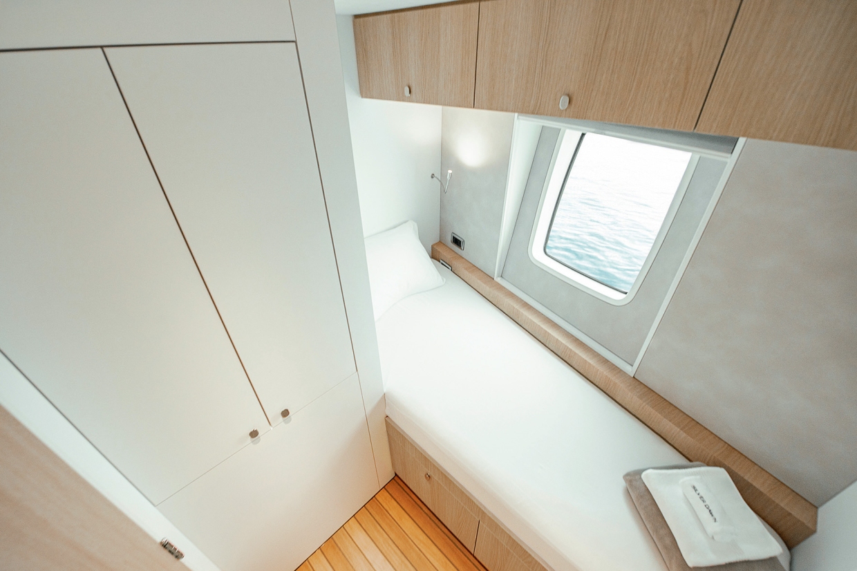 การจัดวางห้องพักลูกเรือไว้บริเวณด้านหน้าเรือ เชื่อมโยงอย่างลงตัวกับพื้นที่หัวเรือที่ออกแบบให้เป็นโซนสำหรับการสังสรรค์ นั่นหมายความว่าการเสียสละพื้นที่ปริมาตรภายในไม่ใช่เรื่องสำคัญนัก อีกทั้งยังช่วยให้เข้าถึงเลาน์จ์ของลูกเรือได้ง่ายขึ้นผ่านช่องทางหัวเรือ ที่ซ่อนอยู่บริเวณด้านหน้าสุดของโต๊ะอาหารหัวเรือบนดาดฟ้า โดยเลาน์จ์นี้เชื่อมต่อกับโถงกลางของดาดฟ้าล่างอย่างพอดี แม้ลูกเรือจะยังต้องใช้บันไดหลักในการเข้าถึงห้องบังคับการเดินเรือ และครัว แต่ก็สามารถเดินจากท่าเรือไปยังห้องพักของตนได้โดยไม่ต้องผ่านห้องนั่งเล่นภายใน หรือรุกล้ำความเป็นส่วนตัวของแขกแม้แต่น้อย สิ่งอำนวยความสะดวก สำหรับลูกเรือ ก็ถูกออกแบบเป็นอย่างดี มีห้องกัปตันขนาดเหมาะสมอยู่ฝั่งกราบซ้าย และห้องนอน 2 ชั้นแบบสว่างสดใสพร้อมห้องน้ำในตัวอยู่ฝั่งกราบขวา โดยทั้งหมดใช้วัสดุ และการตกแต่งคุณภาพเดียวกับห้องพักแขก นอกจากนี้ ยังออกแบบได้อย่างชาญฉลาดเพื่อจัดการกับพื้นที่หัวเรือที่แคบลงเมื่อโค้งเข้าหากัน ส่วนพื้นที่เลาน์จ์หัวเรือก็จัดเต็มด้วยสิ่งอำนวยความสะดวกเช่นกัน ไม่ว่าจะเป็นตู้เย็น อุปกรณ์ทำอาหาร อ่างล้างจาน รวมถึงทีวี