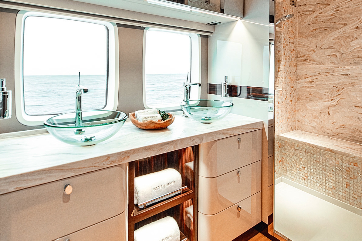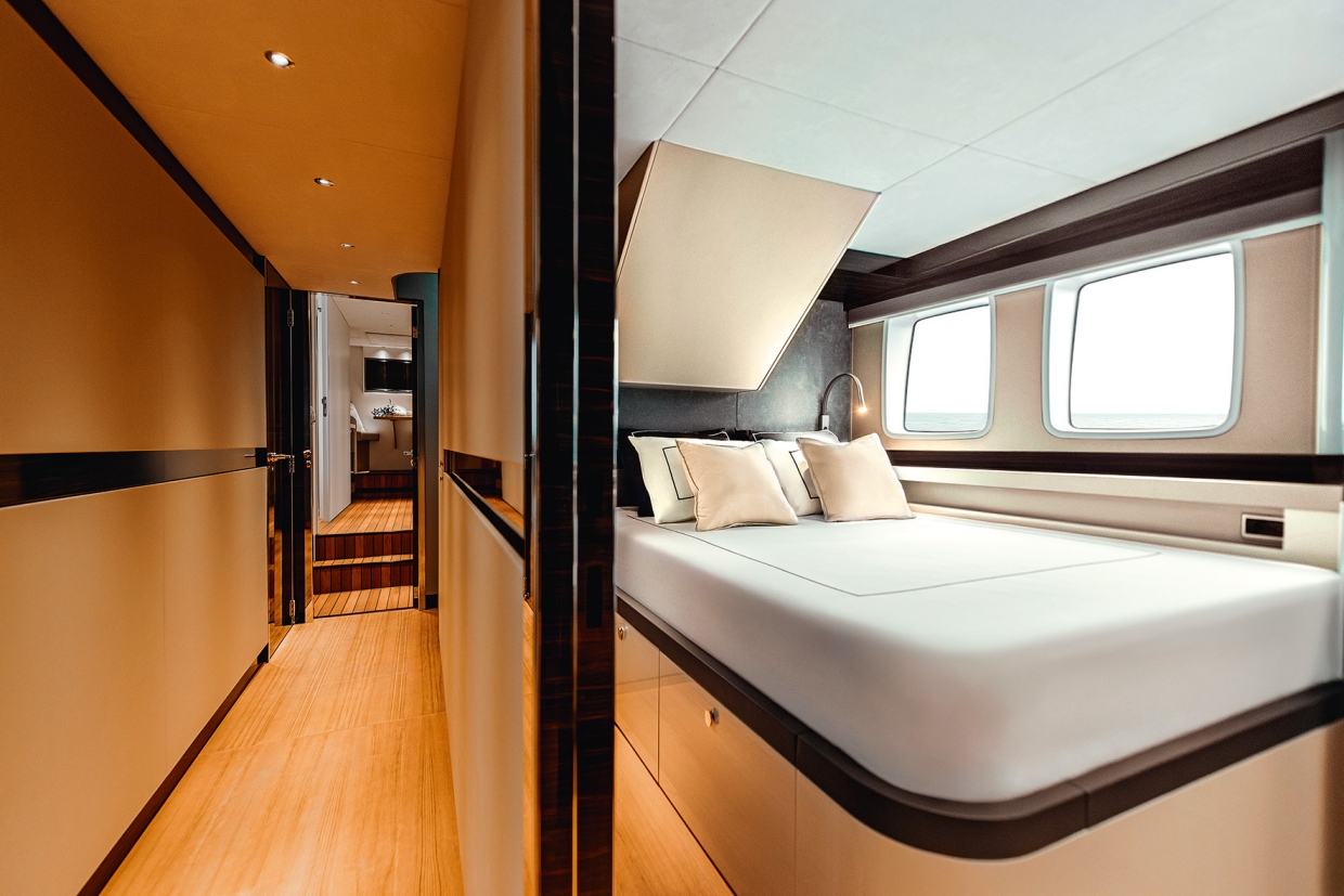 ถัดไปด้านหน้าเป็นห้องพักคู่ 2 ห้องที่มีรูปแบบโดยรวมเกือบสมมาตร วางอยู่สองฝั่งของทางเดินกลาง แม้ว่า ZEELANDER จะชื่นชอบเส้นโค้งที่โอ่อ่า การจัดวางที่นี่กลับให้ความรู้สึกเป็นธรรมชาติ ห้องน้ำกลางวันแบบขวาง ก็ออกแบบได้ดีไม่แพ้กัน โดยตั้งอยู่ตรงข้ามกับบันไดโค้งที่ทอดตัวลงมาจากฝั่งกราบขวาของห้องนั่งเล่น