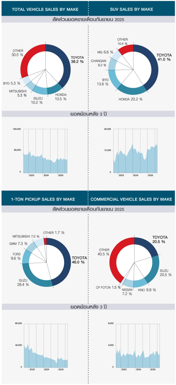จบไตรมาส 3 ของปี รถใหม่ป้ายแดงจำหน่ายรวมทั้งสิ้น 449,286 คัน เพิ่มขึ้นจากช่วงเดียวกันของปี 2567 ถึง 10,627 คัน หรือเพิ่มขึ้น 2.4 % ยอดจำหน่ายสะสมมากสุดยังคงเป็น TOYOTA จำหน่ายไปแล้ว 167,800 คัน เพิ่มขึ้น 582 คัน หรือเพิ่มขึ้น 0.3 % ส่วนแบ่งการตลาด 37.3 % อันดับ 2 ISUZU จำหน่ายไปแล้ว 53,503 คัน ลดลง 11,766 คัน หรือลดลง 18.0 % ส่วนแบ่งการตลาด 11.9 % อันดับ 3 HONDA จำหน่ายแล้ว 51,009 คัน ลดลง 7,302 คัน หรือลดลง 12.5 % ส่วนแบ่งการตลาด 11.4 % อันดับ 4 BYD จำหน่ายแล้ว 32,281 คัน เพิ่มขึ้น 10,044 คัน หรือเพิ่มขึ้น 45.2 % ส่วนแบ่งการตลาด 7.2 % และอันดับ 5 MITSUBISHI จำหน่ายแล้ว 20,492 คัน เพิ่มขึ้น 136 คัน หรือเพิ่มขึ้น 0.7 % ส่วนแบ่งการตลาด 4.6 %