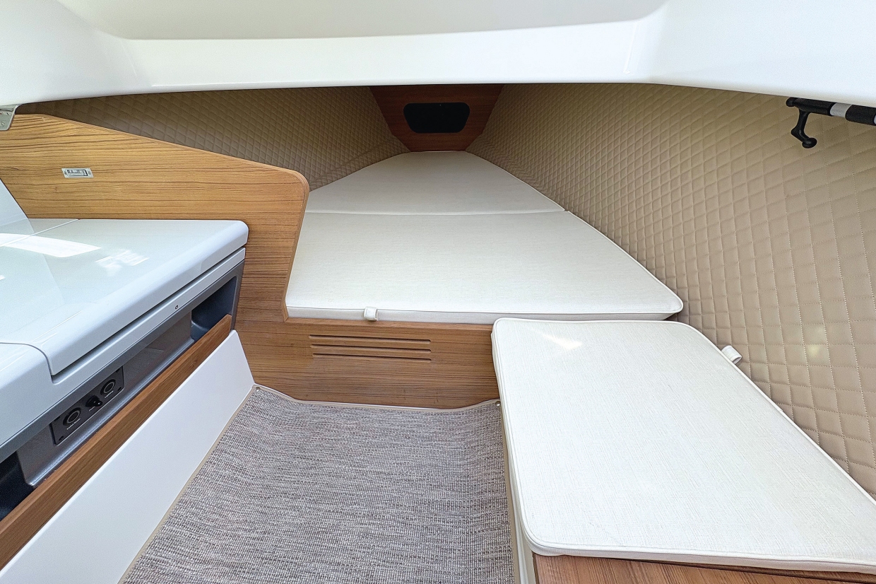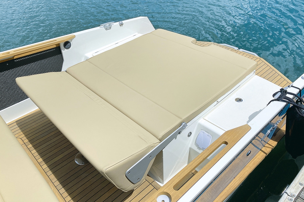 เมื่อก้าวขึ้นไปด้านหน้า ผ่านขั้นบันไดเล็กๆ หน้าคอนโซล คุณจะพบดาดฟ้าหน้าเรือที่ปูไม้สักเรียบแบนตลอดแนว ซึ่งดูสวยงามไม่แพ้ส่วนอื่น แน่นอนว่าคุณสามารถเลือกวัสดุปูพื้นแบบอื่น หรือเพิ่มชุดเบาะได้ เบาะเหล่านั้นมีรอยตะเข็บตามแนวยาวกลางลำ ทำให้พับเบาะด้านหนึ่งขึ้นได้ เพื่อใช้งานดาดฟ้าในการเทียบท่าโดยไม่ต้องยกเบาะออก แม้เรือทดสอบจะตกแต่งค่อนข้างเรียบ แต่ดาดฟ้าหน้าก็ใช้งานได้มากกว่าที่คิด ด้วยราวสำหรับสเปรย์ฮูด และแผงโซลาร์เซลล์ขนาด 60 วัตต์ ที่ออกแบบให้แนบไปกับรูปทรงคอนโซลอย่างแนบเนียนจนแทบไม่ทันสังเกต