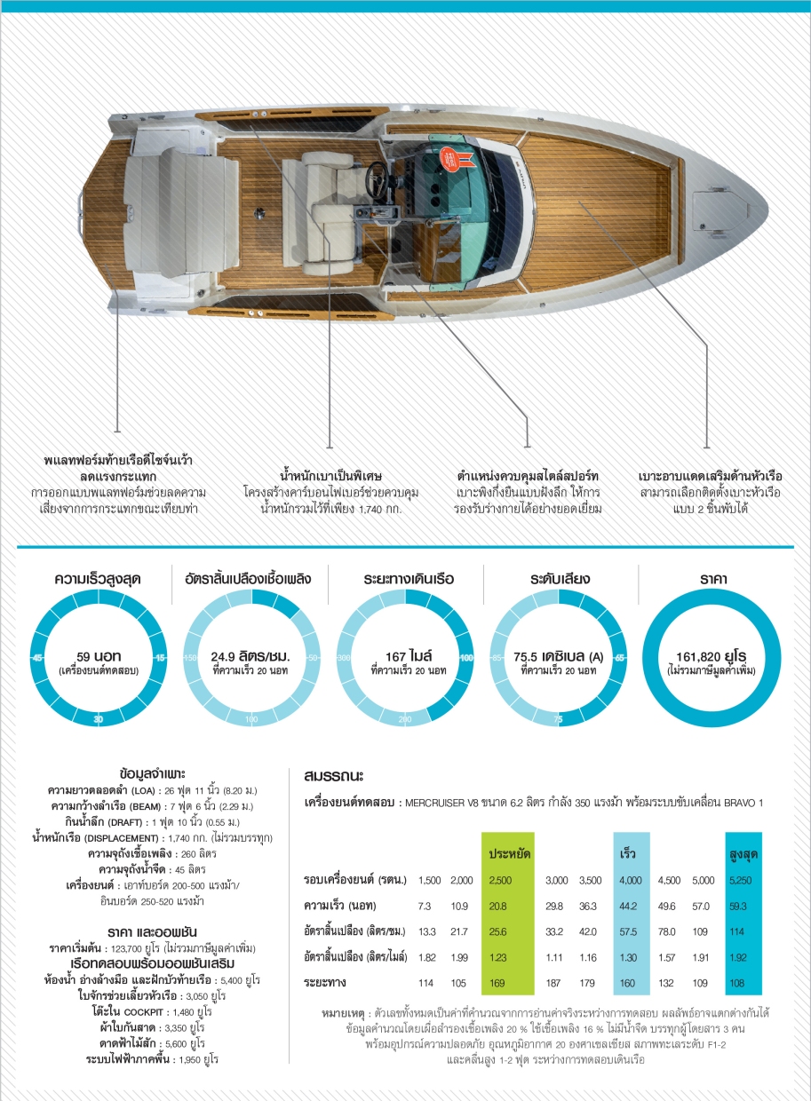 คันเร่งอลูมิเนียมแบบ ZERO EFFORT สไตล์เรซิง ก็เป็นอีกจุดที่น่าชื่นชม โดยใช้คันหนึ่งสำหรับเลือกเดินหน้า เกียร์ว่าง หรือถอยหลัง และอีกคันหนึ่งสำหรับควบคุมรอบเครื่องยนต์ นอกจากจะดูเท่และแปลกตาแล้ว ยังให้การควบคุมความเร็วที่ละเอียดมากขึ้น จากระยะการเคลื่อนที่ของคันเร่งที่ยาวกว่า กล่าวโดยสรุป นี่คือเรือที่ขับสนุก แต่ก็เป็นเรือที่ “สอนคนขับ” ไปพร้อมกัน ด้วยโครงเรือแบบสูญญากาศที่แข็งแกร่ง และน้ำหนักเบา ความกว้างลำเรือที่แคบ เครื่องยนต์อินบอร์ด 350 แรงม้า พร้อมใบพัดเดี่ยว หากขับแบบขาดความละเอียดอ่อน เรือจะเตือนคุณอย่างรวดเร็ว แต่เมื่อขับด้วยความเข้าใจ และให้เกียรติ มันจะลอยตัวได้อย่างเรียบเนียน เร่งความเร็วอย่างดุดัน และเข้าโค้งด้วยการยึดเกาะที่มั่นคง และเฉียบคม