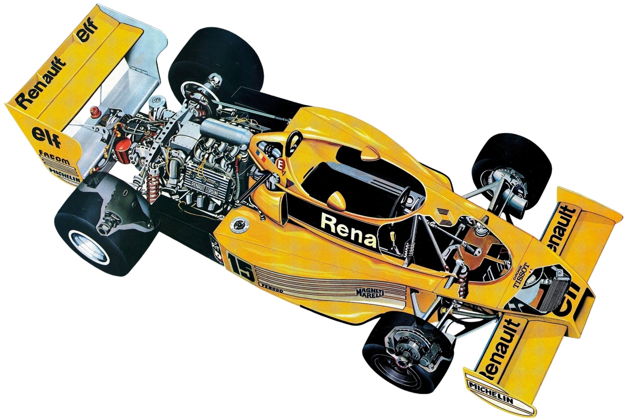 รถแข่งสูตรหนึ่งเปิดรับเครื่องยนต์เทอร์โบเข้ามาเป็นส่วนหนึ่งของการแข่งขันในปี 1977 ด้วยเครื่องยนต์ RENAULT (เรอโนลต์) ในรถที่มีชื่อว่า RS01 (อาร์เอส 01) ที่แฟนๆ F1 ทุกคนจำได้ เพราะมันมีสีเหลืองสด แม้ว่าในช่วงแรกมันออกจะจุกจิก และพังง่าย แต่ศักยภาพนั้นเป็นที่ประจักษ์ และทำให้ผู้ผลิตรายอื่นหันมาพัฒนาเครื่องยนต์เทอร์โบ ไม่ว่าจะเป็น FERRAI (แฟร์รารี), BMW, HONDA (ฮอนดา) และ TAG-PORSCHE (แทก-โพร์เช)