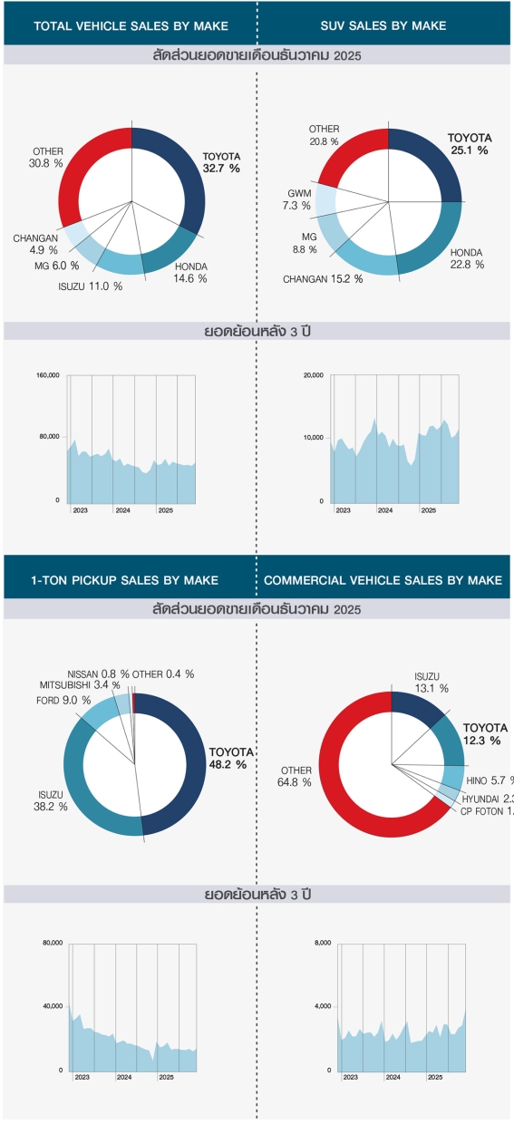 ส่วนรถพิคอัพ 1 ตัน เดือนธันวาคม 2568 ปิดยอดขายด้วยตัวเลขยอดจำหน่ายที่เพิ่มขึ้นจากเดือนธันวาคมปี 2567 เล็กน้อย โดยยอดจำหน่ายรวมทั้งตลาดอยู่ที่ 19,105 คัน เพิ่มขึ้น 220 คัน หรือเพิ่มขึ้น 1.2 % อันดับ 1 TOYOTA จำหน่ายได้ 9,213 คัน เพิ่มขึ้นจากเดือนธันวาคมปีที่ผ่านมา 1,152 คัน หรือเพิ่มขึ้น 14.3 % ส่วนแบ่งการตลาดอยู่ที่ 48.2 % อันดับ 2 ISUZU 7,304 คัน ลดลง 23 คัน หรือลดลง 0.3 % ส่วนแบ่งการตลาด 38.2 % อันดับ 3 FORD (ฟอร์ด) 1,729 คัน ลดลง 113 คัน หรือลดลง 6.1 % ส่วนแบ่งการตลาด 9.0 % อันดับ 4 MITSUBISHI 644 คัน ลดลง 540 คัน หรือลดลง 45.6 % ส่วนแบ่งการตลาด 3.4 % และอันดับ 5 NISSAN (นิสสัน) 162 คัน ลดลง 118 คัน หรือลดลง 42.1 % ส่วนแบ่งการตลาด 0.8 %