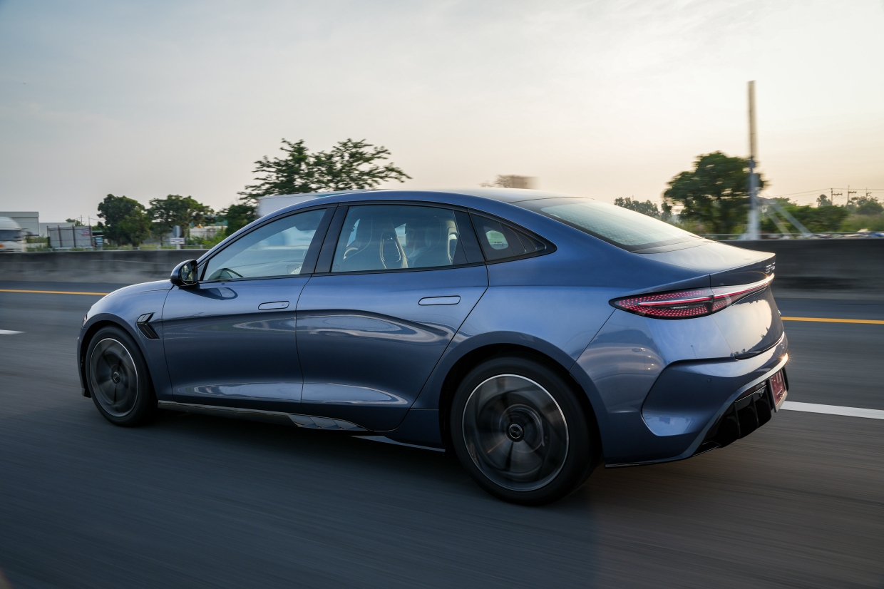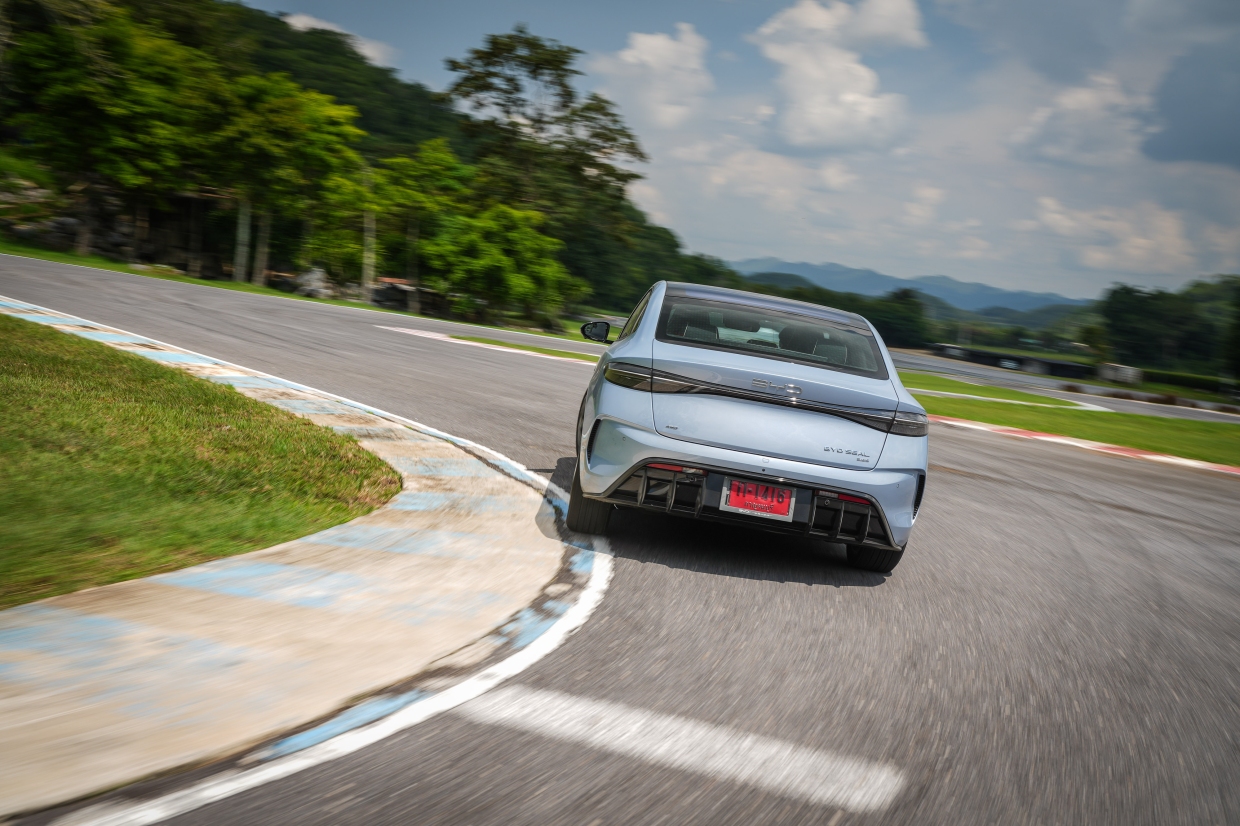 ถัดมา เราเปลี่ยนมาเป็นรุ่นทอพ Performance ขับเคลื่อน 4 ล้อตลอดเวลา กำลังสูงสุดถึง 531 แรงม้า (แบบ PS จากมอเตอร์ทั้ง 2 ชุดหน้า/หลัง) ความรู้สึกโดยรวมมีความแตกต่างจากรุ่นพื้นฐานอย่างเห็นได้ชัด การไต่ความเร็วสามารถทำได้ในพริบตา ตามระดับการกดคันเร่ง ทางผู้ผลิตระบุว่า อัตราเร่ง 0-100 กม./ชม. ทำได้ในเวลา 3.8 วินาที เท่านั้น นับว่ามีความดุดันมากๆ สำหรับผู้ขับที่เท้าหนัก แม้อรรถรสด้านซุ่มเสียงที่เร้าใจแบบเครื่องยนต์สันดาปจะขาดหายไป แต่ความกระแทกกระทั้นของอัตราเร่งสามารถชดเชยได้อย่างแน่นอน อย่างไรก็ตาม เราพบว่า BYD Seal รุ่น Performance สามารถขับขี่แบบเน้นความสะดวกสบายได้ดีเช่นกัน หากใช้โหมดขับเคลื่อนที่เหมาะสม และการกดคันเร่งแบบค่อยเป็นค่อยไป การขับเคลื่อนทำนุ่มนวลไม่แพ้รุ่นย่อยอื่นๆ ไม่ใช่เป็นรถยนต์ระดับ 500 แรงม้า ที่มีความสุดโต่งตลอดเวลา ส่วนระบบรองรับให้ความรู้สึกหนึบนุ่ม เผื่อเหลือให้การใช้งานทั่วไปด้วย การทำอัตราเร่งในทางตรงยังรองรับได้ดี แต่การเข้าโค้งมุมแคบ และการหักเลี้ยวแบบหนักหน่วง ยังคงมีอาการโคลงให้สัมผัส (แม้ระบบรองรับจะใช้ชอคอับแบบ FSD ก็ตาม) หากใครที่ต้องการจะขับแบบเน้นสมรรถนะเป็นส่วนใหญ่ อาจต้องหาหนทางในการเพิ่มความหนึบแน่นให้กับระบบรองรับมากกว่านี้ (ยางที่ใช้ คือ Continental EcoContact สำหรับรุ่นทอพ Performance ควรใช้ยางสไตล์สปอร์ทจะเหมาะสมกว่า)