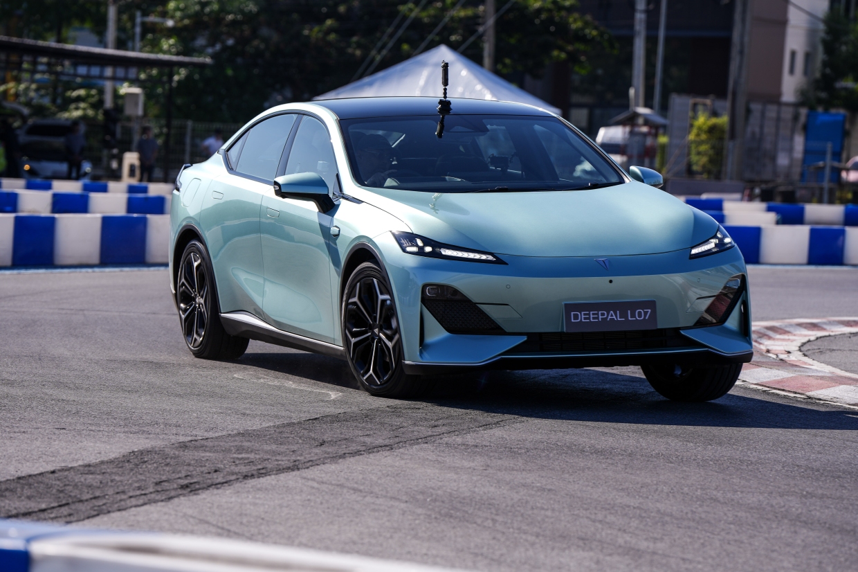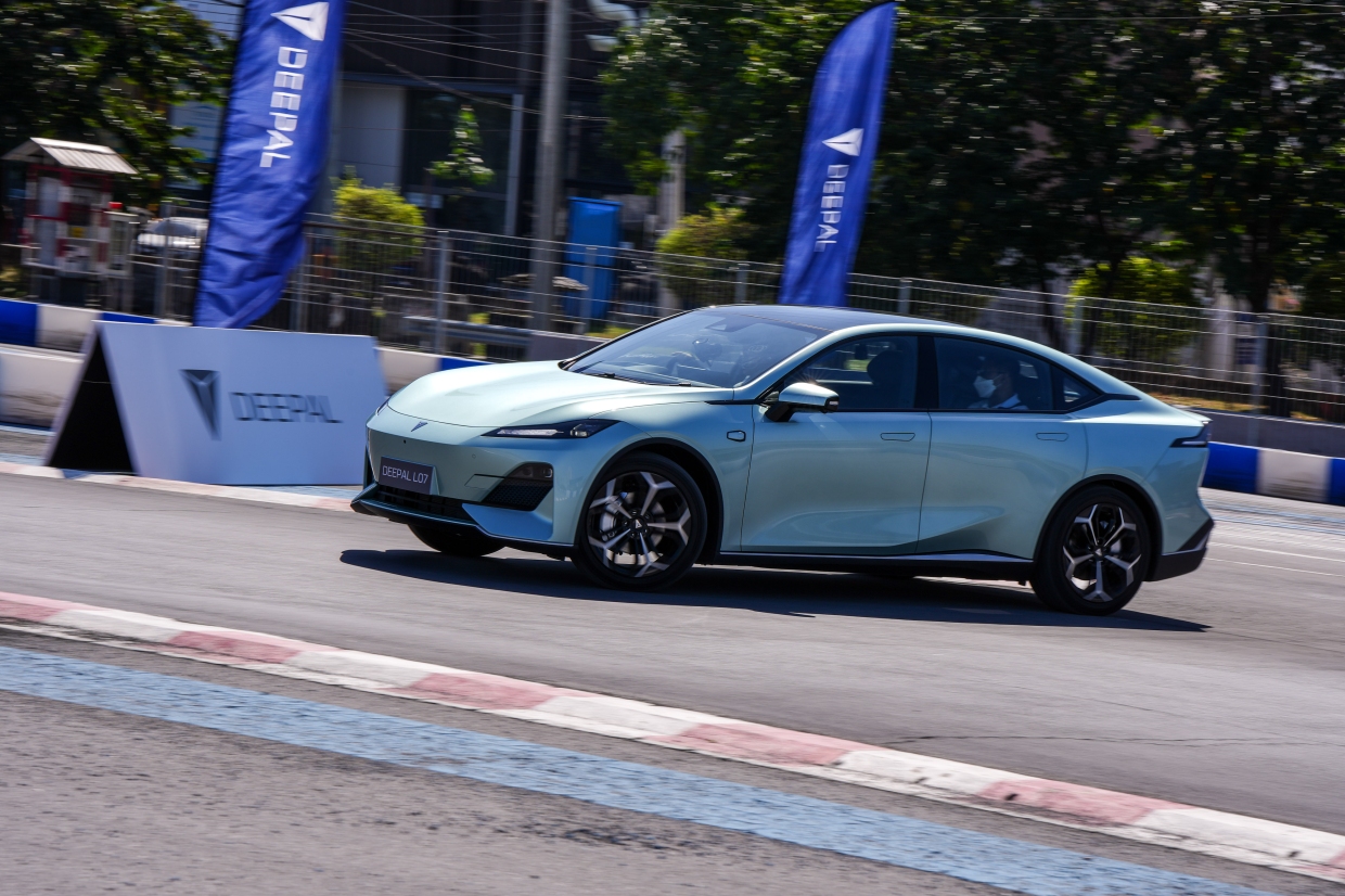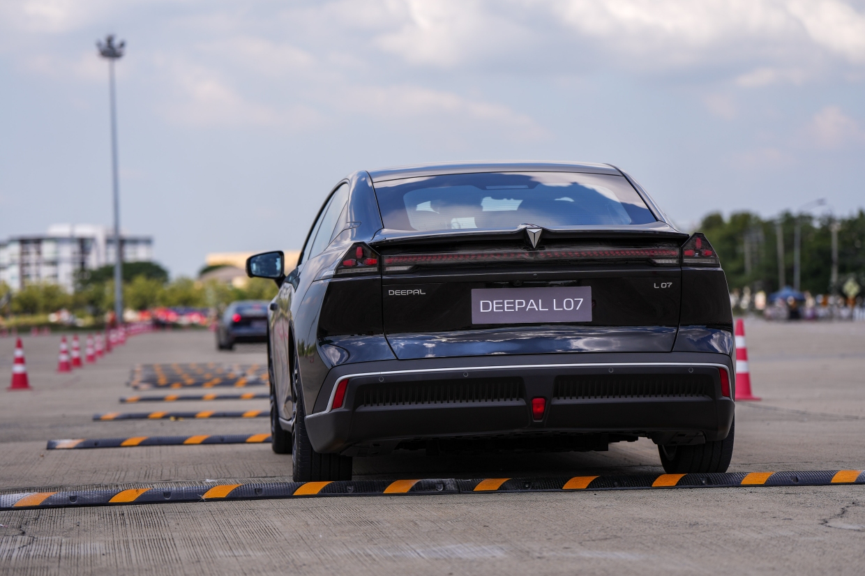 เราเปลี่ยนคันมาที่ Deepal L07 ตัวถังซีดานสไตล์ฟาสต์แบค เส้นสายสปอร์ทลงตัว (คว้ารางวัลการออกแบบระดับโลกมาแล้ว คือ Red Dot Award) ระยะฐานล้อเท่ากับ S07 คือ 2,900 มม. เนื่องจากใช้โครงสร้างตัวถังร่วมกัน ล้อแมกขนาด 19 นิ้ว (ระยะความสูงจากพื้นถนน 150 มม.) มอเตอร์ไฟฟ้า กำลังสูงสุด 258 แรงม้า แบทเตอรีความจุ 66.8 กิโลวัตต์ชั่วโมง แต่ L07 มีระยะทำการสูงสุดมากกว่า S07 จากตัวถังที่เพรียวลมกว่า และมีน้ำหนักน้อยกว่า (ผู้ผลิตระบุมาที่ 540 กม. ส่วน S07 คือ 485 กม. ตามมาตรฐาน NEDC)