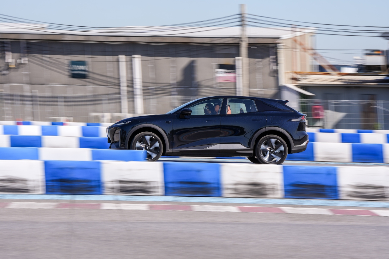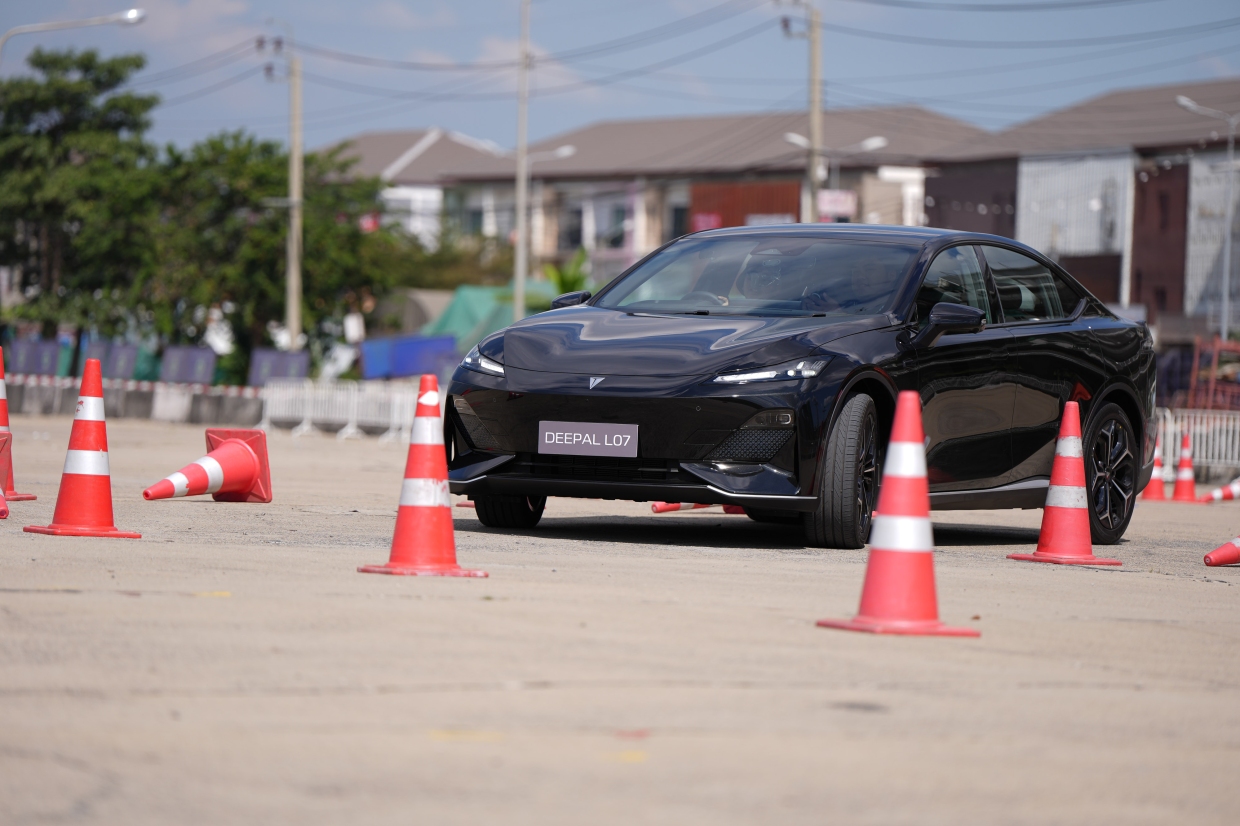 เราเริ่มการทดลองขับภายใต้โหมดการขับแบบปกติก่อน เพื่อทำความคุ้นเคยในช่วงแรก เราพบว่า Deepal S07 เป็นครอสส์โอเวอร์สไตล์เอสยูวี ที่นุ่มนวล พวงมาลัยเบาแรง แต่ยังมีความหนึบ และหนักแน่นในระดับที่พอเหมาะ ตามลักษณะของตัวถัง อาการโคลงของตัวถังมีให้สัมผัสในระดับหนึ่ง แต่ยังอยู่ในระดับที่ควบคุมรถได้ ต่อมาเราเปลี่ยนเป็นโหมดสปอร์ท คันเร่งมีการตอบสนองที่ฉับไวขึ้น (แม้จะกดคันเร่งได้เพียงชั่วระยะเวลาสั้นๆ จากรูปแบบของสนามโกคาร์ท) พวงมาลัยมีน้ำหนักเพิ่มขึ้นเล็กน้อย แต่ยังหักเลี้ยวอย่างต่อเนื่อง และเลี้ยวมุมแคบได้ไม่ยาก