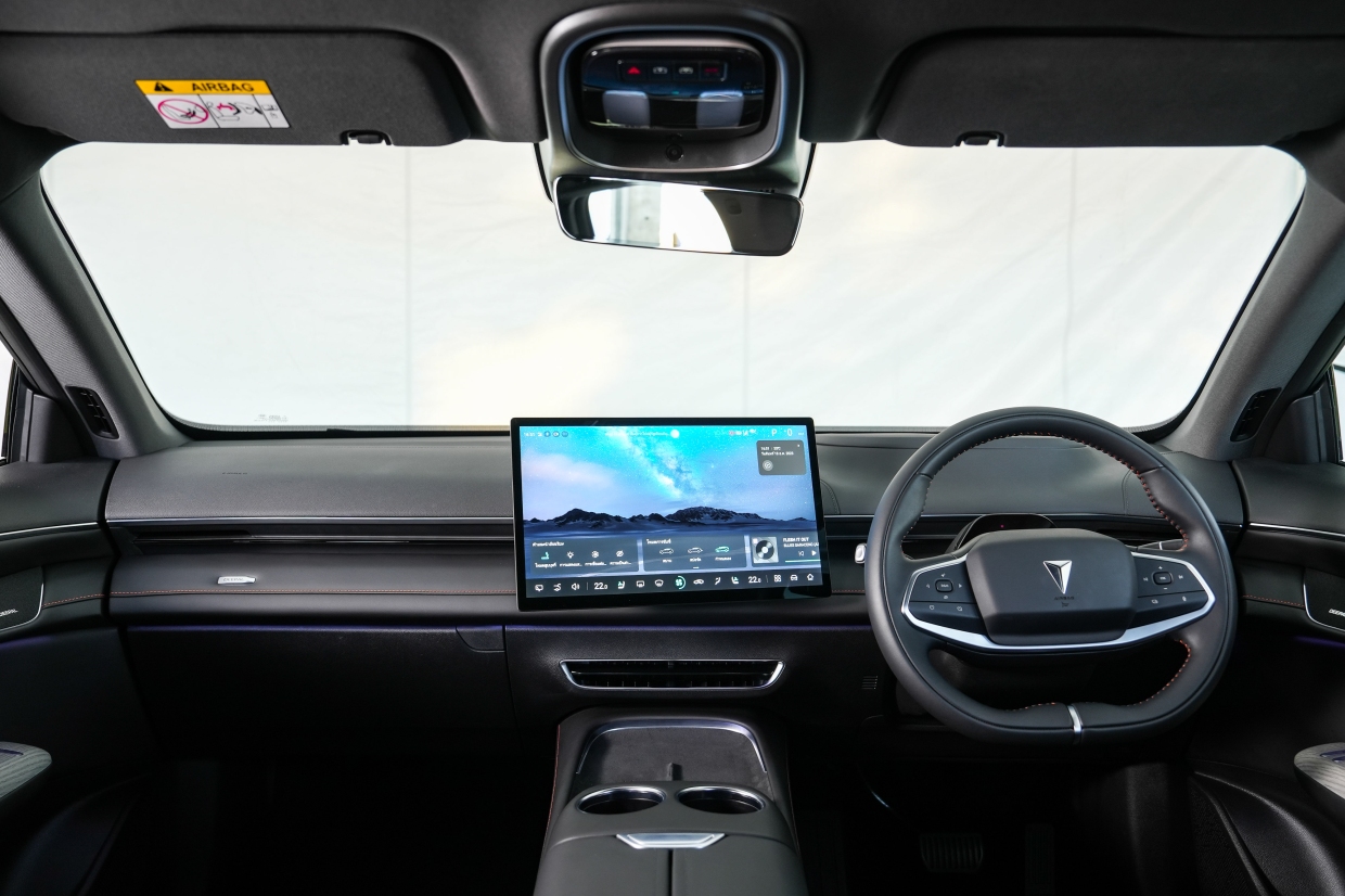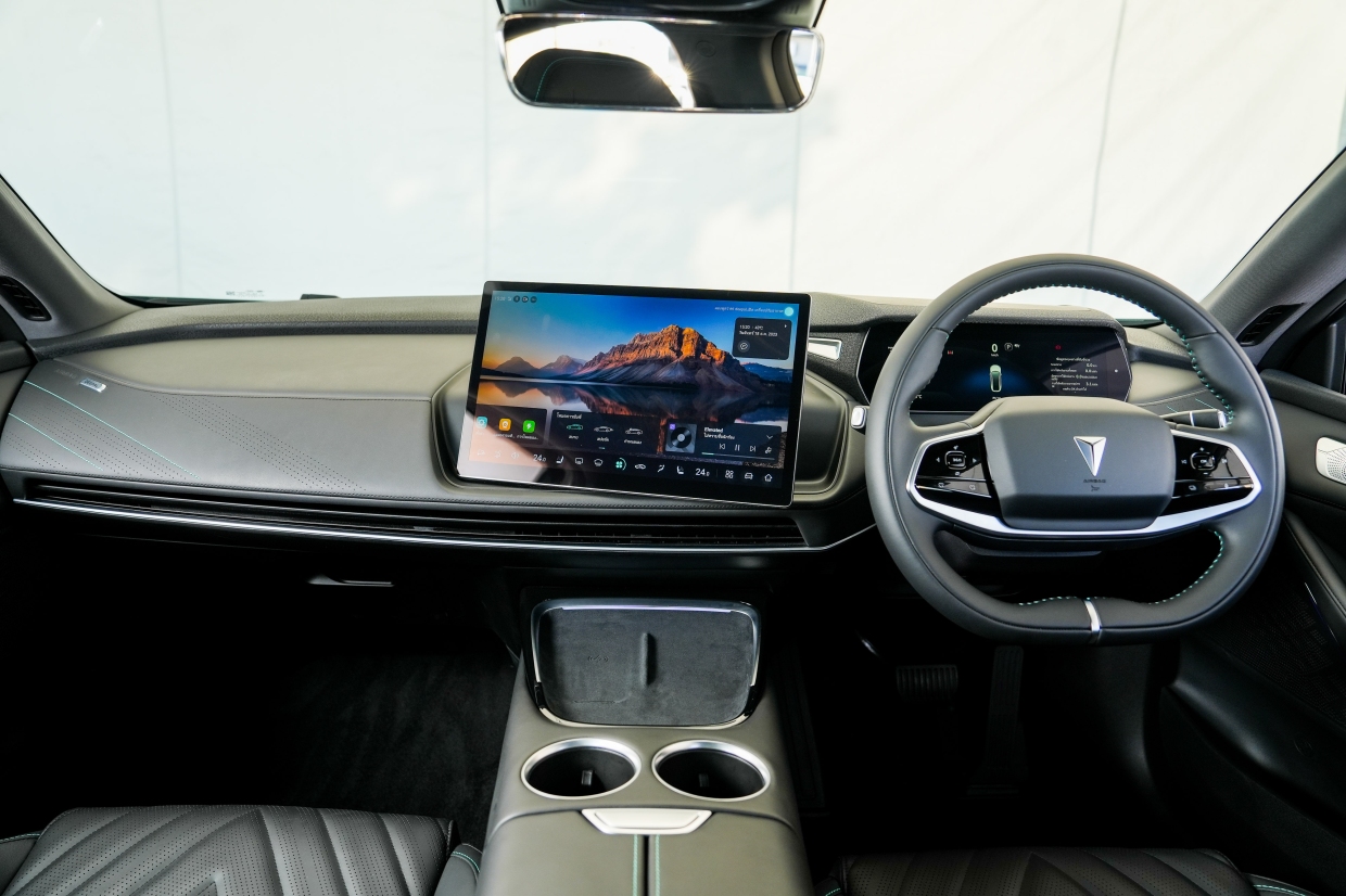 เราเริ่มการทดลองขับกับ Deepal S07 รถยนต์ไฟฟ้าสไตล์ครอสส์โอเวอร์ รูปทรงคมเข้ม ทันสมัย กับมิติตัวถังที่ใหญ่โตระดับ C-SUV ของบ้านเรา ระยะฐานล้อถึง 2,900 มม. ล้อแมกขนาด 20 นิ้ว (มีความสูงจากพื้นถนนที่ 165 มม.) ขณะที่ห้องโดยสารมีการออกแบบที่ได้แรงบันดาลใจจาก “เรือยอชท์” มีลักษณะโอบล้อมรอบผู้โดยสาร ตกแต่งด้วยวัสดุหนังแท้รอบคัน จอแสดงผลหลักขนาดใหญ่ถึง 15.6 นิ้ว แบบ Sunflower นั่นคือ จอภาพสามารถหันทิศทางซ้าย/ขวาไปยังผู้ขับ หรือผู้โดยสารด้านข้างผู้ขับได้ (ทั้งแบบอัตโนมัติ และตามการปรับของผู้โดยสาร) ส่วนสเปคของมอเตอร์ไฟฟ้า มีกำลังสูงสุด 258 แรงม้า (ขับเคลื่อน 2 ล้อหลัง) แรงบิดสูงสุด 32.6 กก.-ม. ความจุแบทเตอรี 66.8 กิโลวัตต์ชั่วโมง