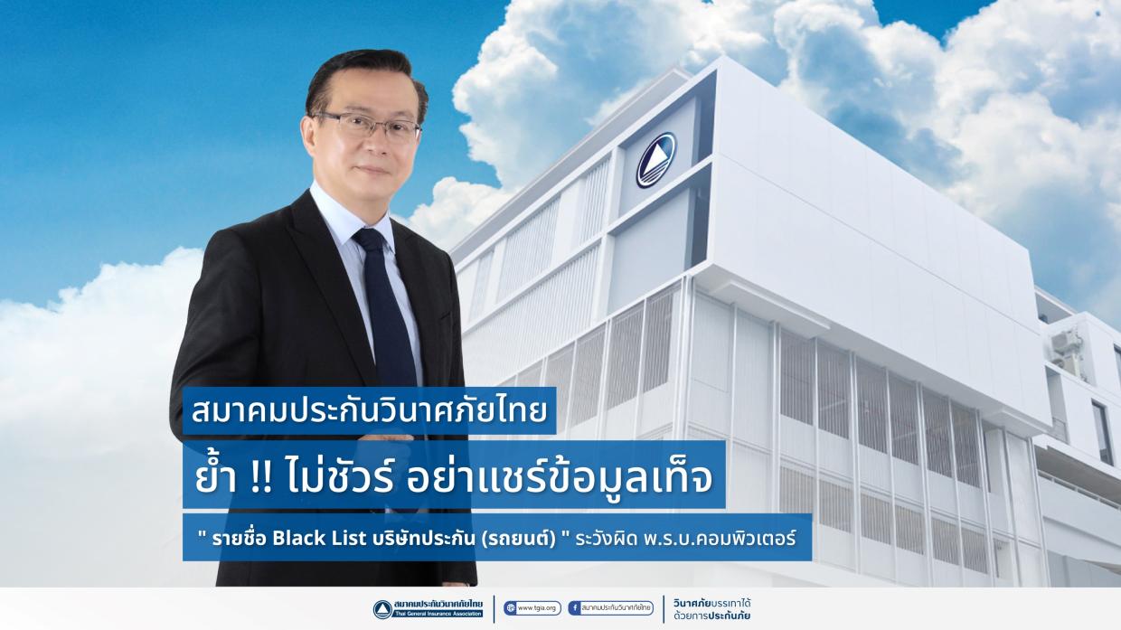 ดร. สมพร สืบถวิลกุล นายกสมาคมประกันวินาศภัยไทย กล่าวว่า จากกรณีที่มีการเผยแพร่ข้อความเกี่ยวกับรายชื่อบริษัทประกัน (รถยนต์) ที่ถูก Black List เนื่องจากสถานะทางการเงิน และการไม่ปฏิ บัติตามสัญญาประกันภัยทางโซเชียลมีเดียนั้น สมาคมประกันวินาศภัยไทยได้ทำการตรวจสอบข้อความดังกล่าวพบว่า เป็นข้อความเก่าที่เคยถูกส่งต่อกันมาแล้วหลายครั้ง และล่าสุดปี 2567 ได้ถูกนำกลับมาเผยแพร่ซ้ำอีกครั้ง โดยข้อความดังกล่าวเป็นข้อความเดิมที่เป็นเท็จ สร้างความเสียหายต่อบริษัทประกันภัย และกระทบต่อภาพลักษณ์ของธุรกิจประกันวินาศภัย รวมถึงทำลายความเชื่อมั่นของผู้เอาประกันภัย และประชาชนเป็นอย่างมาก
