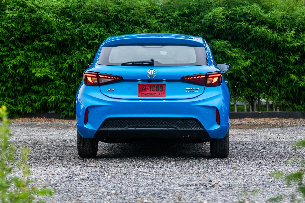 ด้านหลังแนว Hot Hatch ดูร้อนแรง ไฟท้าย MG บอกว่าได้รับแรงบันดาลใจจากปีกผีเสื้อ ลงตัวกับเส้นสาย และความโค้งมนบนตัวรถ มองไปแล้วเหมือนกับ Mazda2 Hatchback มารวมกับ Honda City Hatchback (ฮอนดา ซิที แฮทช์แบค)