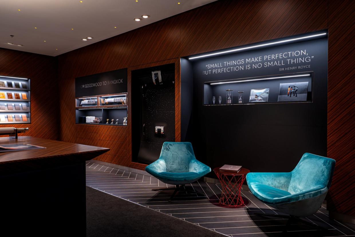 บูทีคที่เปี่ยมด้วยนวัตกรรมแห่งใหม่นี้ ได้รับการรังสรรค์ขึ้นอย่างประณีต และพิถิพิถัน เช่นเดียวกับโชว์รูม Rolls-Royce ที่ใหญ่ที่สุดในโลก บริเวณทางเข้า ลูกค้าจะเดินผ่านประตูที่ออกแบบให้มีลักษณะคล้ายกับกระจังหน้าของ Rolls-Royce ที่ได้แรงบันดาลใจจากเสาของวิหารแพนทิออน พร้อมกับสัญลักษณ์นางฟ้า (Spirit of Ecstasy) ที่อยู่ด้านบน และเมื่อก้าวสู่ด้านใน ก็จะพบกับยนตรกรรม Rolls-Royce ที่จัดแสดงภายใต้ชุดไฟ kinetic lightning ที่สามารถปรับระดับให้ไล้ไปตามแนวหลังคาของ Rolls-Royce แต่ละรุ่นได้อย่างงดงาม ขณะที่มุมพักผ่อนด้านหน้าจะมีพื้นที่จัดแสดงงานศิลป์สุดหรูหลากหลายแบรนด์ เรียกว่า "Cabinet of Curiosities" เพื่อสร้างแรงบันดาลใจ และเชิญชวนให้เกิดการสนทนาอย่างสร้างสรรค์