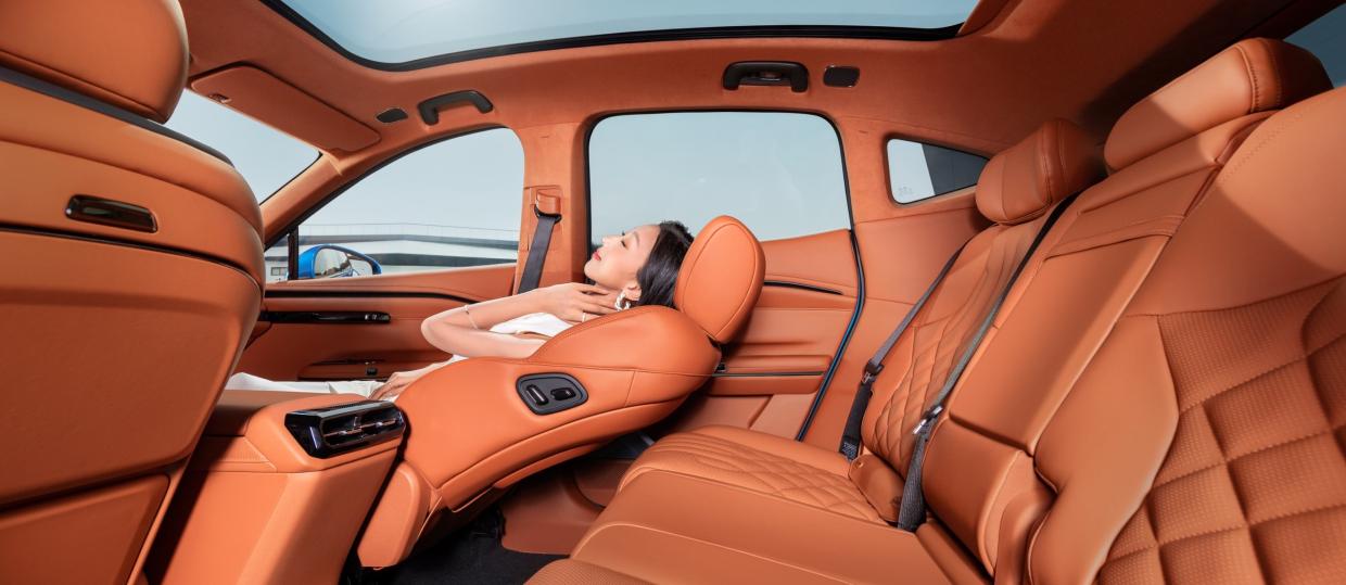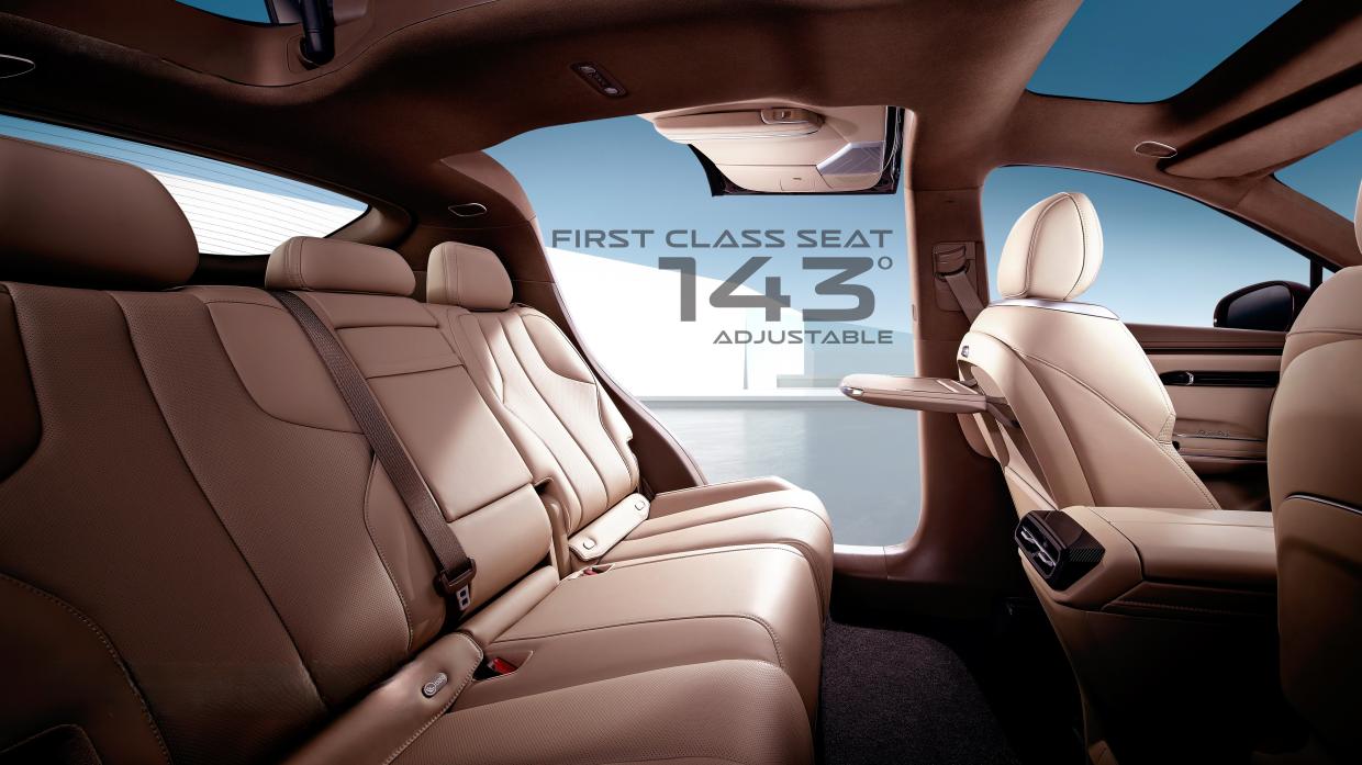 เบาะนั่งโดยสารที่นั่งตอนหน้าระดับพรีเมียมแบบ Full Comfort Seat หุ้มด้วยวัสดุหนัง Nappa คุณภาพสูง พร้อมที่รองขาด้านหน้า สามารถปรับระดับด้วยไฟฟ้า 8 ทิศทาง พร้อมระบบ Lumbar support 4 ทิศทาง พร้อมด้วยระบบเบาะนวดแบบ 10 จุด Massage Function และที่นั่งตอนหลังแบบ Heavenly King Seat สร้างประสบการณ์ใหม่แห่งความหรูหราแบบเฟิร์สต์คลาสส์ ด้วยพนักพิงเบาะหลังสามารถปรับระดับเอนได้สูงสุด 143° กว้างที่สุดในรถยนต์เซกเมนท์เดียวกัน และยังมีฟังค์ชันเบาะทำความร้อนระบายอากาศ Seat Ventilation เพิ่มความผ่อนคลายตลอดทั้งการเดินทาง
