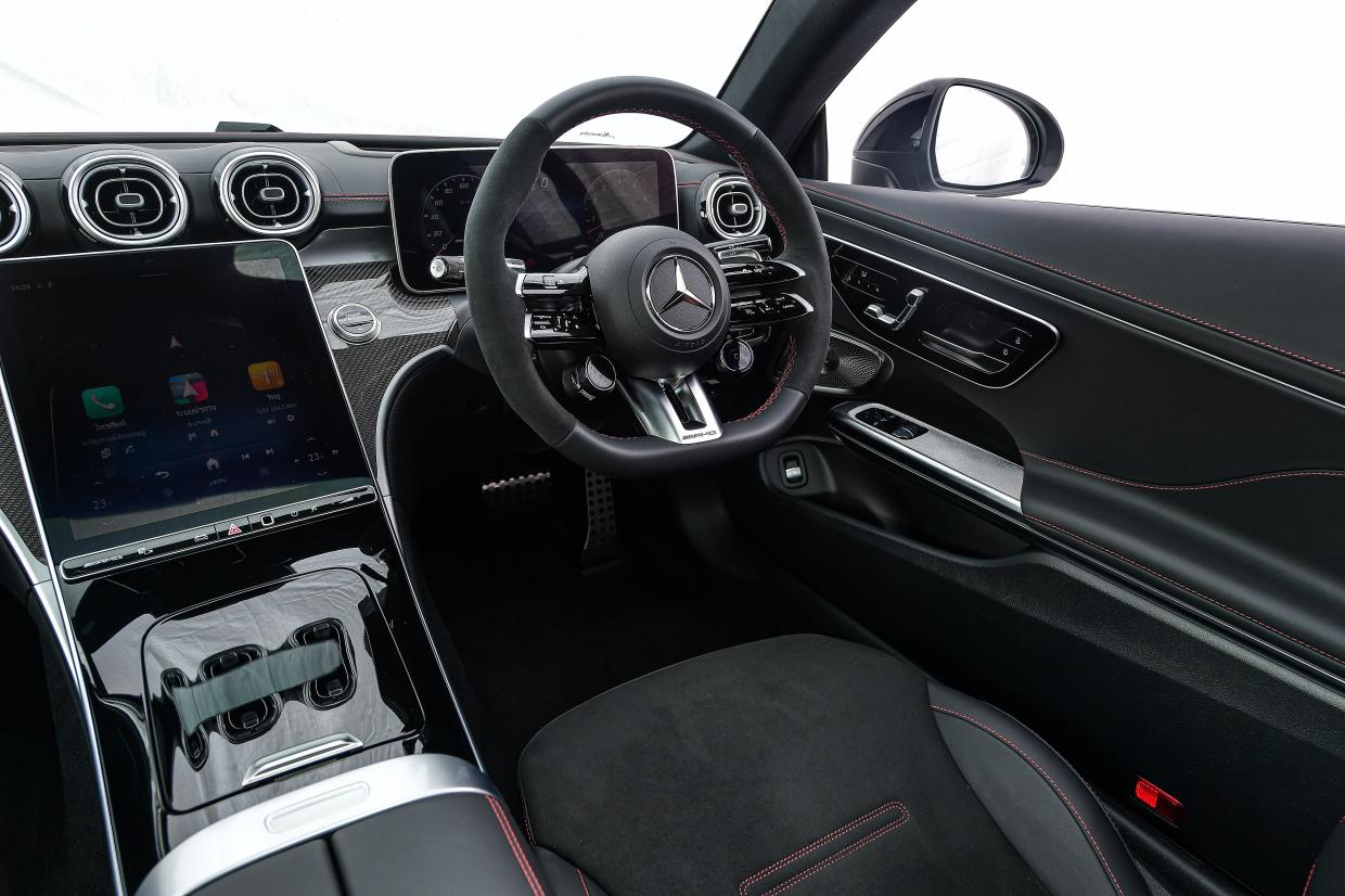 ภายในห้องโดยสารมอบรายละเอียดการตกแต่งที่โดดเด่นตามสไตล์สปอร์ทในทุกองค์ประกอบ ไม่ว่าจะเป็น พวงมาลัย AMG Performance steering wheel พร้อมระบบพวงมาลัย AMG Steering 3 สเตจ ติดตั้งเบาะนั่งหุ้มด้วยหนัง และไมโครไฟเบอร์ ให้ความรู้สึกนุ่มสบายขณะโดยสาร มอบการขับขี่ที่เหนือกว่าด้วยระบบปฏิบัติการ MBUX Gen20x ที่ออกแบบมาตามรูปแบบโปรแกรม AMG ไม่ว่าจะเป็น หน้าจอธีมพิเศษของ AMG การวัดแทรคสนาม และการเรียนรู้ด้วยระบบ AI ที่จะผสานเข้ากับการทำงานของโหมด routine ทำให้สามารถเรียนรู้ข้อมูลของผู้ขับขี่แต่ละบุคคล และบันทึกไว้ในระบบเพื่อความสะดวกสบายแบบอัตโนมัติ นอกจากนี้ยังมาพร้อม AMG Head-up Display, MBUX augmented reality for navigation และระบบเสียง Burmester® 3D surround sound system ลำโพง 17 ตัว กำลังขับ 710 วัตต์ พร้อม Dolby Atmos ช่วยมอบเสียงเพลงที่คมชัดสมจริงรอบทิศทางราวกับอยู่ในสตูดิโอ