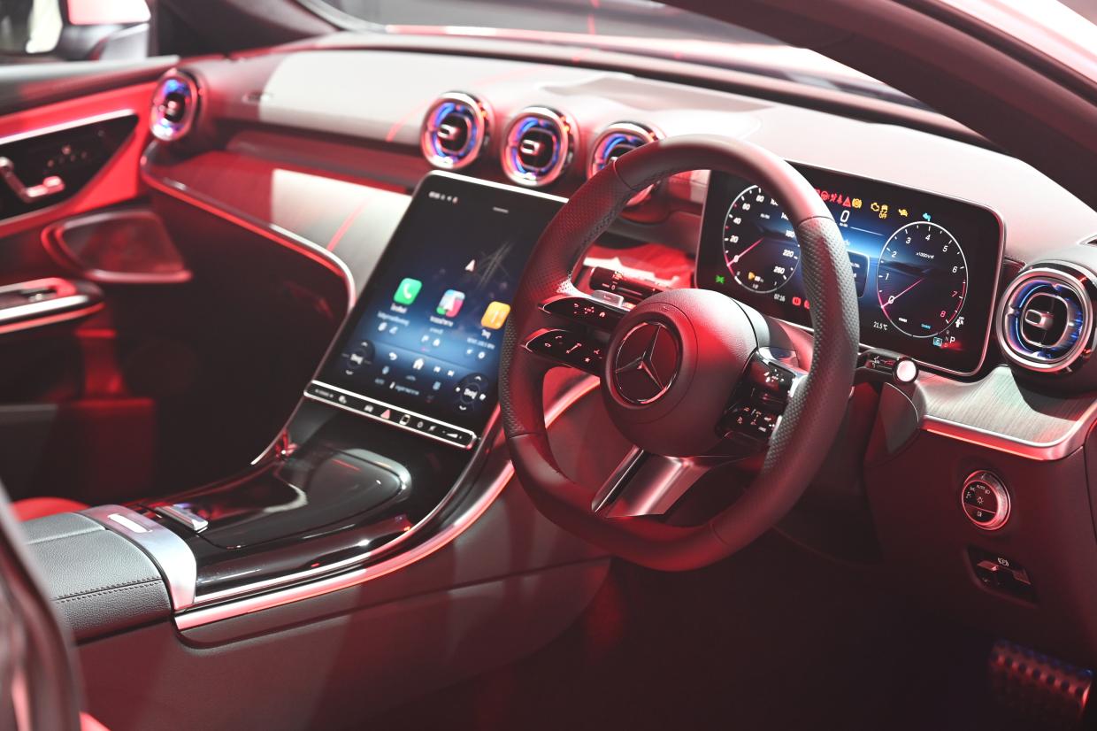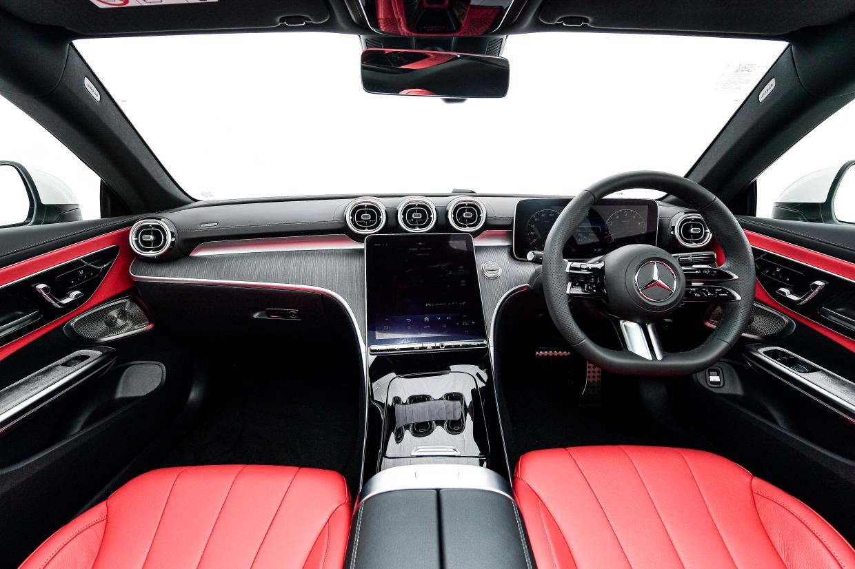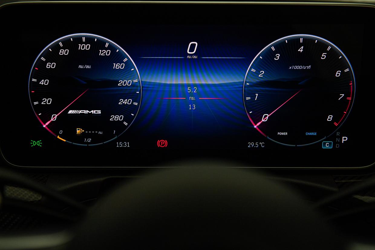 ทางด้านดีไซจ์นภายในมีการตกแต่งแบบ AMG Interior Package มอบความรู้สึกแบบสปอร์ทลักชัวรีด้วยแผงคอนโซลกลางแบบ high-gloss black สีดำ ด้านบนของคอนโซลหน้า (Instrument panel) และด้านบนของแผงประตูหุ้มด้วยหนัง ARTICO ตกแต่งลายแบบ Nappa เสริมความดุดันด้วยเบาะนั่งหุ้มหนังทรงสปอร์ทสีแดงภายในห้องโดยสาร และสะดวกกับการขับขี่ไปกับพวงมาลัยมัลทิฟังค์ชันแบบสปอร์ท แสดงผลด้วยหน้าจอรูปแบบใหม่ที่สามารถล็อกอินเข้าใช้งานด้วยระบบ Fingerprint scanner หน้าจอแสดงผลการขับขี่แบบ Digital ขนาด 12.3 นิ้ว และหน้าจอบริเวณคอนโซลกลางขนาด 11.9 นิ้ว ในส่วนของระบบฟอกอากาศแบบ ENERGIZING AIR CONTROL และระบบควบคุมอุณหภูมิอัตโนมัติ THERMATIC 2 โซน ก็ถูกติดตั้งมาอย่างครบครัน