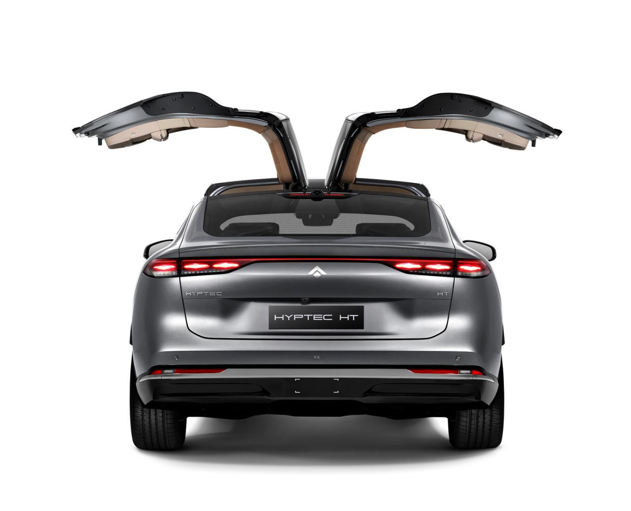 Hyptec HT ถูกออกแบบอย่างพิถีพิถันเหมือนผลงานศิลปะ เปรียบเสมือนแสง และเงาที่ไหลเวียนบนพื้นผิวที่เคลื่อนไหวอย่างอ่อนโยน ตามหลักแนวคิด Aesthetics of Mechanics and Humanity สุนทรียศาสตร์ทางกลไกที่ผสมผสานกับความเป็นมนุษย์ ด้วยเส้นสายที่โค้งมน และลื่นไหล พร้อมด้วยดีไซจ์นหลังคาแบบลาดเอียง (Fastback) ช่วยเพิ่มประสิทธิภาพด้านอากาศพลศาสตร์ ดีไซจ์นด้านหน้าได้รับแรงบันดาลใจจาก อัญมณีคริสทัล ที่ผ่านการเจียระไนอย่างพิถีพิถัน สร้างรูปลักษณ์หน้ารถที่เต็มเปี่ยมด้วยความลึกลับ และสง่างามด้วยเทคนิคการขัดอัญมณี ไฟหน้าดีไซจ์น Diamond Cut การออกแบบแบบคลาสสิคที่ได้รับแรงบันดาลใจจากเพชร ส่องประกายอย่างสดใส ไฟท้าย Horizon ดีไซจ์นไฟท้ายแบบรัน-ทรู ส่องแสงยามค่ำคืนเหมือนเส้นขอบฟ้าที่งดงาม โดยไฮไลท์ที่โดดเด่นของ Hyptec HT ก็คือ ประตูปีกนก (Gull Wing Doors) ที่นอกจากจะดูสวยงาม และโดดเด่น ยังมอบพื้นที่การขึ้นลงขนาดใหญ่เป็นพิเศษด้วยความสูงของการเปิดที่ 2.3 ม. ทำให้ไม่จำเป็นต้องก้มศีรษะ หรือย่อตัวเมื่อต้องขึ้นหรือลงจากรถ สามารถเปิดประตูในที่จอดรถแคบๆ ได้อย่างง่ายดาย ต้องการระยะด้านข้างเพียง 34 ซม. เพื่อเปิดประตู ทำให้ปรับตัวได้ดีกับพื้นที่จอดรถทั่วไป ระบบหลีกเลี่ยงสิ่งกีดขวางอัจฉริยะของระบบประตูปีกนกติดตั้งเรดาร์ 12 จุด ทำให้การเปิดประตูมีความชาญฉลาด และปลอดภัยยิ่งขึ้น ระบบดูดประตูไฟฟ้า ช่วยให้ประตูเปิด/ปิดได้อย่างเงียบสนิทโดยไม่ส่งเสียงรบกวน (เฉพาะรุ่น 620 Luxury)