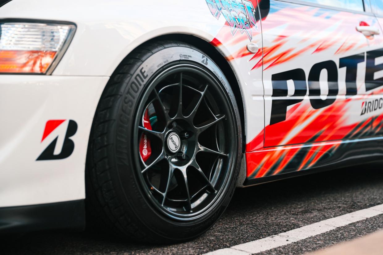 นอกเหนือจากการคิดค้น และพัฒนาด้วยนวัตกรรมเอกสิทธิ์เฉพาะของ Bridgestone เพื่อตอบโจทย์การขับขี่แบบสปอร์ท เบื้องหลังยางสปอร์ทสมรรถนะสูง Potenza Adrenalin RE004 ยังได้รับการทดสอบกับรถสปอร์ทซีดานอย่าง Mitsubishi Lancer Evolution 8 MR (มิตซูบิชิ แลนเซอร์ เอโวลูชัน 8 เอมอาร์) ตำนานรถแรลลี (WRC) ขับเคลื่อน 4 ล้อที่มาพร้อมเทคโนโลยีขั้นสูงขึ้นแท่นเป็นตำนานรถแรงจากสนามแข่งของประเทศญี่ปุ่น ด้วยเอกลักษณ์ที่โดดเด่นอย่างเครื่องยนต์ 4G 63 280 แรงม้า จึงช่วยให้ Bridgestone สามารถออกแบบยางออกมาได้อย่างสมบูรณ์ โดยเมื่อย้อนกลับไปในปี พศ. 2548 Bridgestone ได้นำรถดังกล่าวเข้ามา ถือเป็นรถเพียง 1 ใน 7 คัน ที่ถูกนำเข้ามาในไทยแบบ Full Body เพื่อนำมาใช้พัฒนา และทดสอบประสิทธิภาพยางสปอร์ทตัวดังหลากหลายรุ่น ณ สนามทดสอบไทย Bridgestone ได้แก่ Potenza G3, Potenza RE001 และ Potenza RE002 เพื่อตอบโจทย์ให้แก่การขับขี่แบบสปอร์ทได้ทรงพลัง ขับสนุก และปลอดภัยสำหรับผู้ที่ชอบความเร็ว
