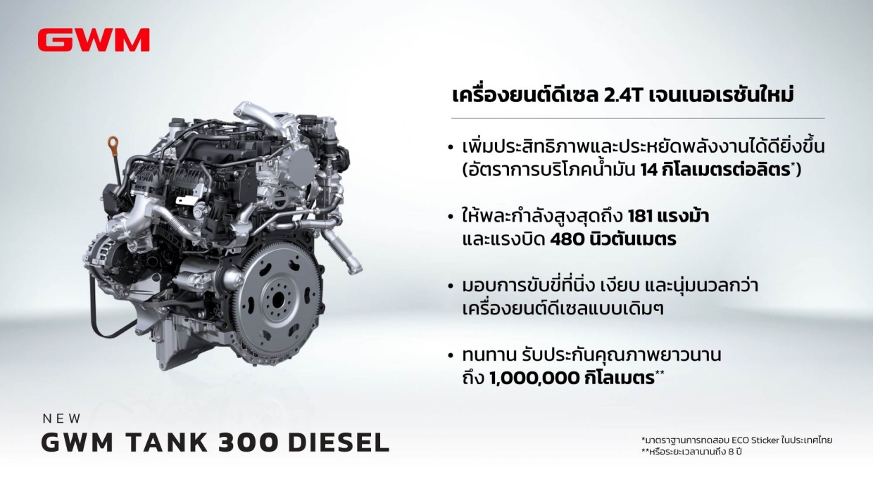 ขุมพลังเครื่องยนต์ดีเซล 2.4T ใหม่นี้ มาพร้อมกับเทคโนโลยีเทอร์โบแปรผัน (VGT) ที่มีแรงดันสูงถึง 2,000 บาร์ ควบคุมด้วยระบบอีเลคทรอนิคส์ ท่อร่วมไอดีแบบคู่ที่ฝาสูบระบบอีเลคทรอนิคส์ Exhaust Gas Recirculation (ECR) และระบบปั้มน้ำมันเครื่องแบบแปรผัน ทำให้เครื่องยนต์สร้างพละกำลังได้อย่างมีประสิทธิภาพ การเผาไหม้ที่สมบูรณ์ยิ่งขี้น ช่วยลดการปล่อย์ไอเสีย NOx และประหยัดน้ำมันเชื้อเพลิง นอกจากนั้นเกียร์อัตโนมัติ 9 จังหวะ ที่มีช่วงอัตราทดเกียร์ที่กว้างถึง 8.843 ทำให้รถสามารถเปลี่ยนเป็นเกียร์ 9 ได้ที่ความเร็วเพียง 90 กม./ชม. ช่วยให้เครื่องยนต์สามารถปรับอัตราการเปลี่ยนเกียร์ให้เหมาะสมกับการขับขี่ในแต่ละสภาพถนน และสอดคล้องกับการทำงานของเครื่องยนต์เพื่อลดการใช้พลังงานที่ไม่จำเป็นออกไป โดยอัตราการบริโภคน้ำมันของ New GWM Tank 300 Diesel อยู่ที่ 14 กม./ลิตร (ตามมาตรฐานการทดสอบ Eco Sticker ในประเทศไทย) สำหรับรุ่นขับเคลื่อน 2 ล้อ ซึ่งน้ำมัน 1 ถัง (ดีเซล B7) สามารถขับขี่ได้ระยะทางไกลมากกว่า 1,000 กม. ดังนั้น เครื่องยนต์ดีเซล 2.4T ใหม่ของ GWM จึงเป็นตัวเลือกที่น่าสนใจสำหรับผู้ที่มองหารถยนต์ที่มีประสิทธิภาพสูงในการขับขี่ คุ้มค่า และประหยัดพลังงานได้ดียิ่งขึ้น