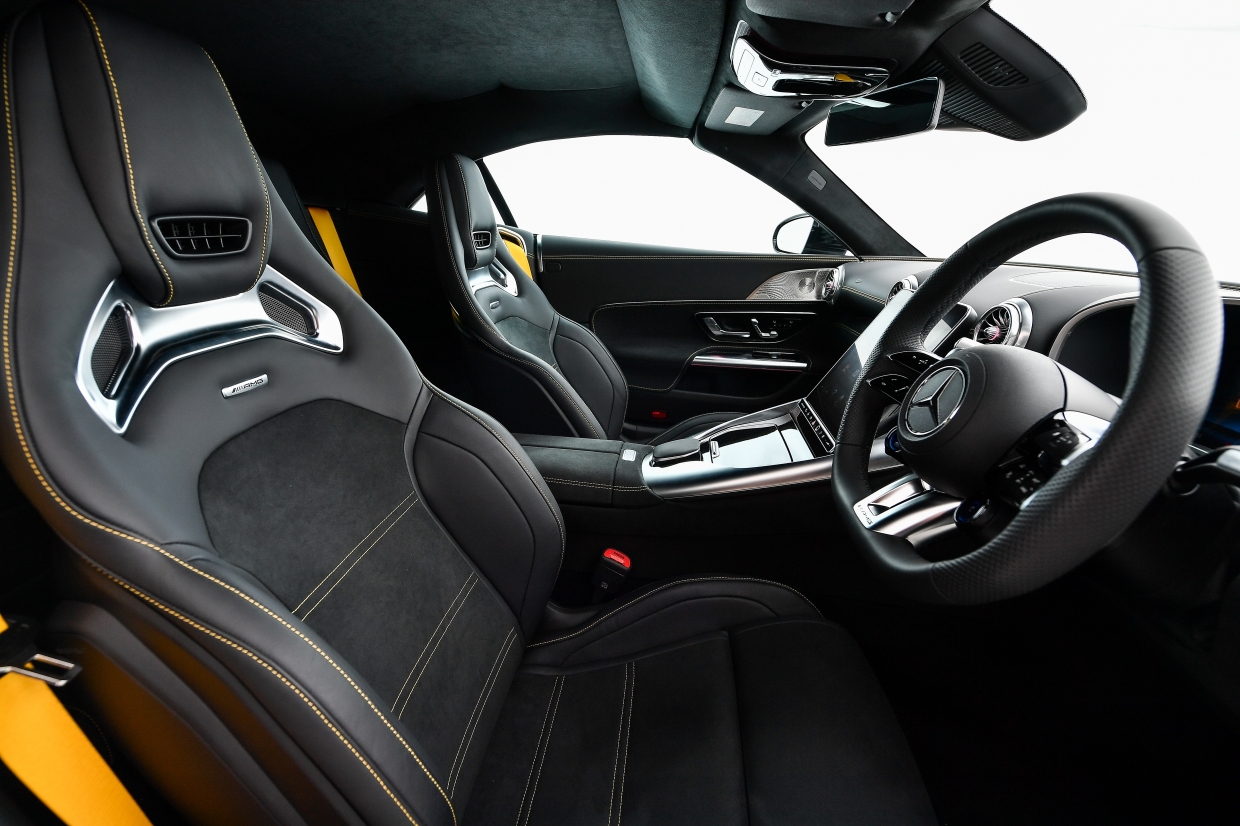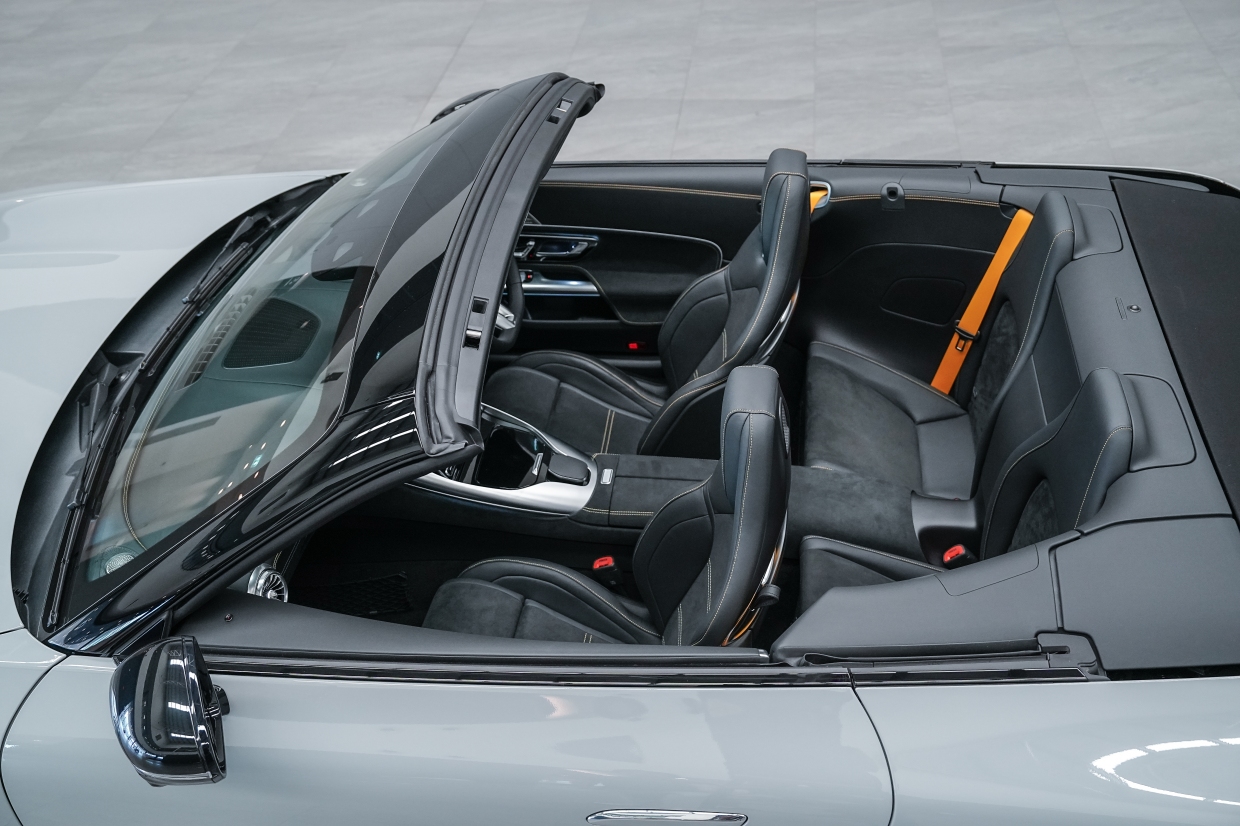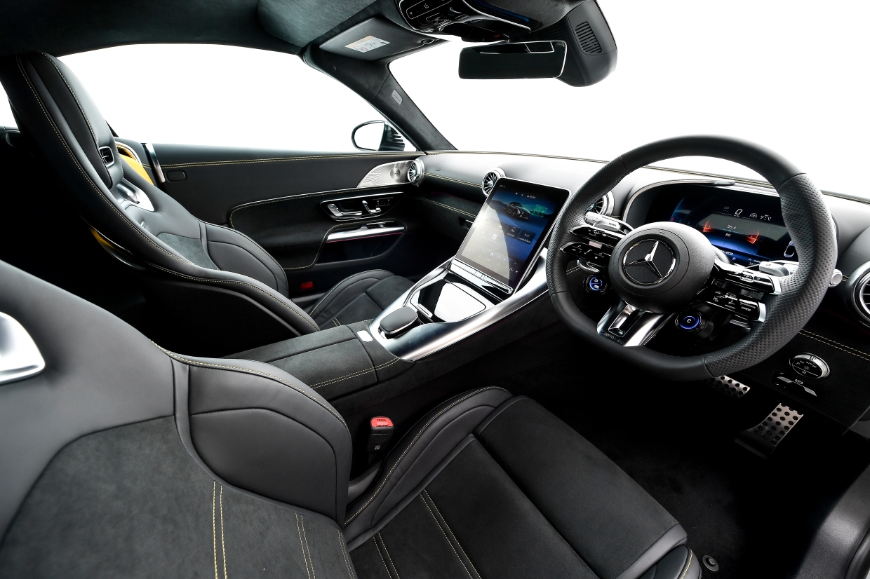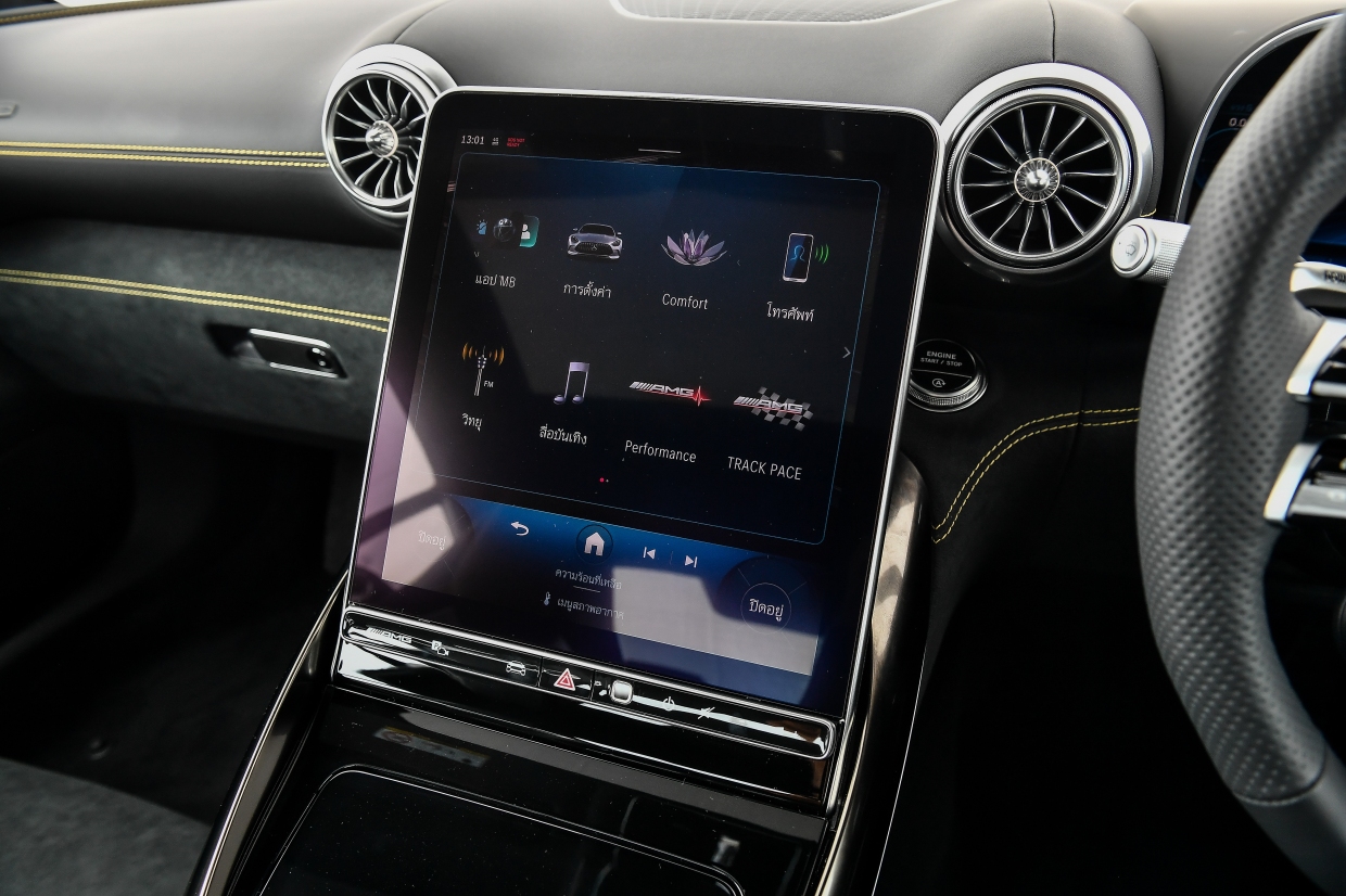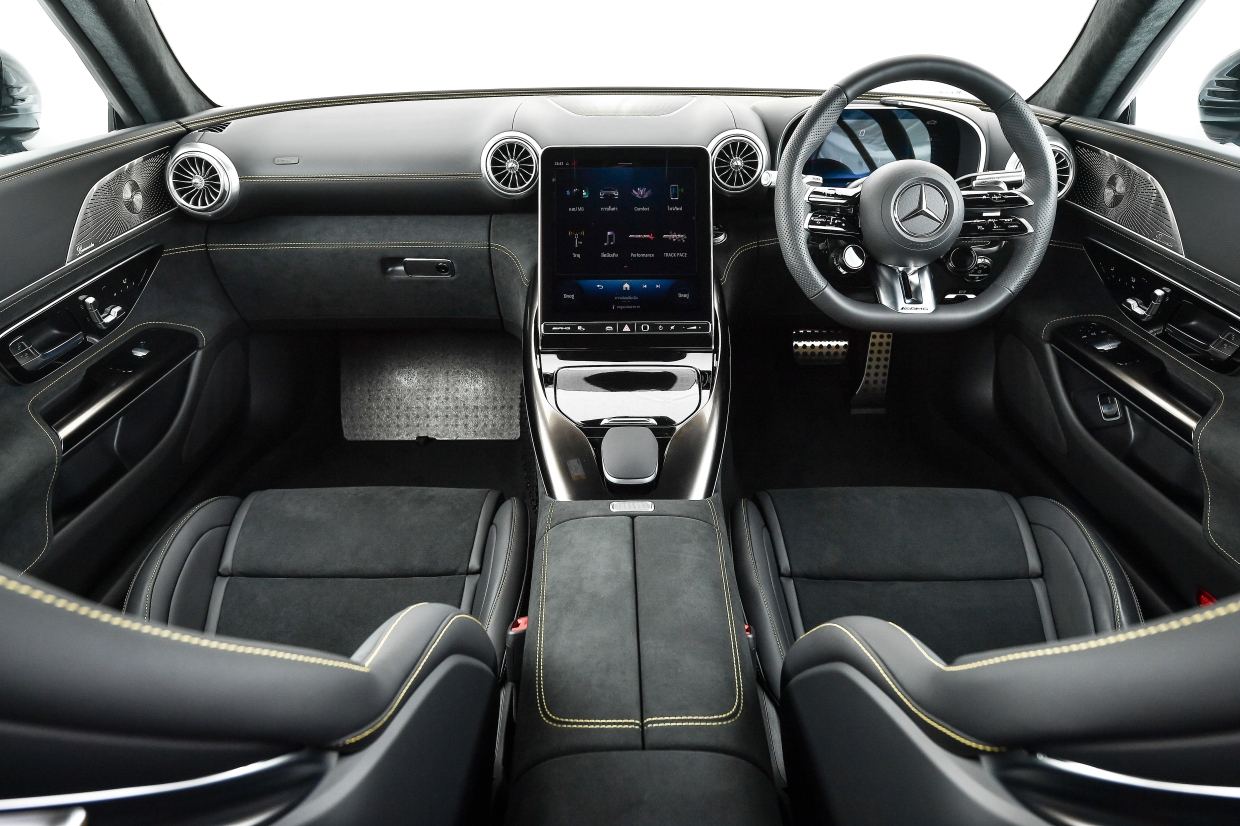 ภายในห้องโดยสารมาพร้อมระบบปฏิบัติการ MBUX7 ที่จะมอบประสบการณ์การขับขี่ระดับเฟิร์สต์คลาสส์ในทุกวินาทีที่อยู่ในห้องโดยสาร และหน้าจอขนาด 11.9 นิ้ว ที่สามารถควบคุมได้ด้วยระบบสัมผัส และปรับระดับด้วยระบบไฟฟ้า 12-32 องศา ช่วยปรับให้มองเห็นหน้าจอได้ชัดเจนยิ่งขึ้น พร้อมป้องกันแสงสะท้อนจากการเปิดหลังคาที่มากระทบหน้าจอ ส่วนจอหน้าที่นั่งคนขับเป็นหน้าจอขนาด 12.3 นิ้ว แบบ AMG-specific indicator ที่ทั้งสปอร์ท โฉบเฉี่ยว และเร้าใจ นอกจากนี้ ยังติดตั้งพวงมาลัยแบบ AMG Performance steering wheel นุ่มกระชับมือด้วยหนัง Nappa leather และเบาะที่นั่ง AMG Sport seats พร้อม Airscarf